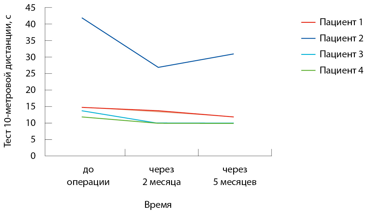 Несмотря на отсутствие четкого тренда на регрессию баллов по шкале MDS-UPDRS; часть III; у 3 из 4 пациентов регистрировали улучшение ходьбы при выполнении TUG-теста (рис. 2) и увеличение скорости прохождения дистанции в 10 метров (рис. 3). Исключение составил пациент 2; имевший исходно существенно более тяжелый функциональный статус. По результатам оценки по опросникам ABC и PDQ-8 на 2-й месяц после хирургического лечения все пациенты отмечали улучшение; однако к 5-му месяцу вновь возникала тенденция к субъективному ухудшению состояния (таблица).