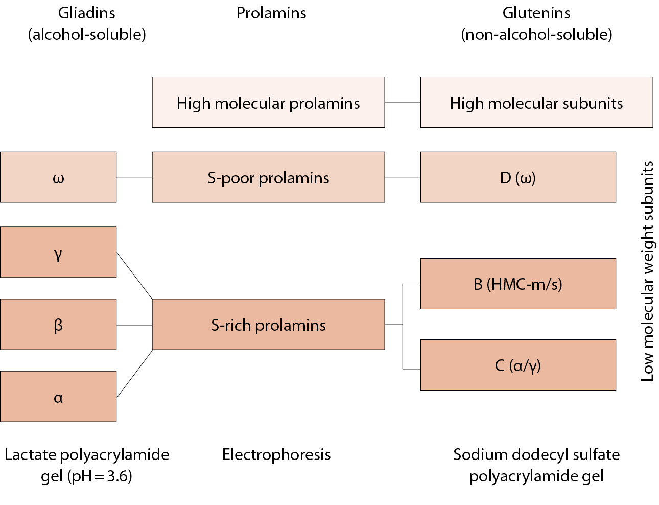 Смесь белков глютена в зерновке пшеницы можно разделить в зависимости от их структур и свойств на подгруппы – глютенины и глиадины. В процессе выпекания глютенины образуют более высокие губчатые структуры путем сшивания, что приводит к желаемой воздушной мягкости в конечном продукте выпечки. Глиадины способствуют стабилизации полостей и сетчатой структуры. Эти губчатые структуры глиадинов хранят воду и углекислый газ, особенно хорошо во время приготовления и выпекания. Глиадины на основе их аминокислотных последовательностей и подвижности при электрофорезе при низком pH делятся на α-, β-, γ- и ω-типы, а восстановленные субъединицы глютенина – на группы с высокой и низкой молекулярной массой [15].