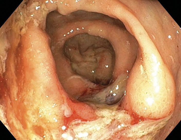 Рис. 1. Эндофото до лечения. В восходящей ободочной кишке и куполе слепой кишки видны щелевидные глубокие язвенные дефекты