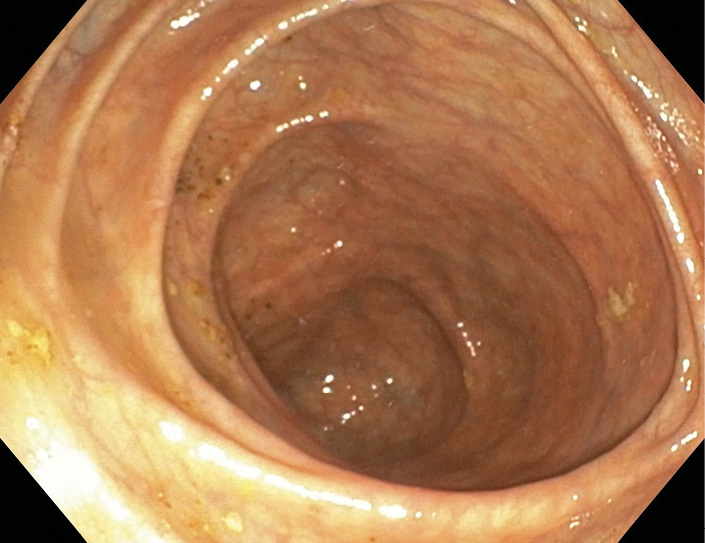 Основной диагноз сформулирован как «кишечный амебиаз, хроническое течение». Проводилась терапия метронидазолом 500 мг 3 раза в день 10 дней. После лечения проведен анализ кала методом формалин-эфирного осаждения на наличие яиц гельминтов, трофозоитов, цист простейших – Entamoeba histolytica не обнаружено, выявлены цисты других паразитов (Blastocystis spp., Entamoeba coli). Основной диагноз: кишечный амебиаз, реконвалесцент. Сопутствующее: носитель Entamoeba coli, Blastocystis spp. Рекомендовано лечение синбиотиком (препарат Максилак) 1 раз в день 10 дней. На фоне терапии пациентка отмечает исчезновение урчания и уменьшение вздутия живота. При контрольной колоноскопии наблюдалась положительная динамика в слизистой оболочке толстой кишки, ее заживление без рубцовых изменений (рис. 3). По данным проведенного через 3 месяца анализа кала методом формалин-эфирного осаждения на наличие яиц гельминтов, трофозоитов, цист простейших не обнаружено ни Entamoeba histolytica, ни других паразитов (Blastocystis spp., Entamoeba coli). Согласно клиническим рекомендациям по ведению пациентов с амебиазом, для профилактики рецидива заболевания рекомендовано динамическое наблюдение в течение 6 месяцев со сдачей контрольных анализов кала [1].