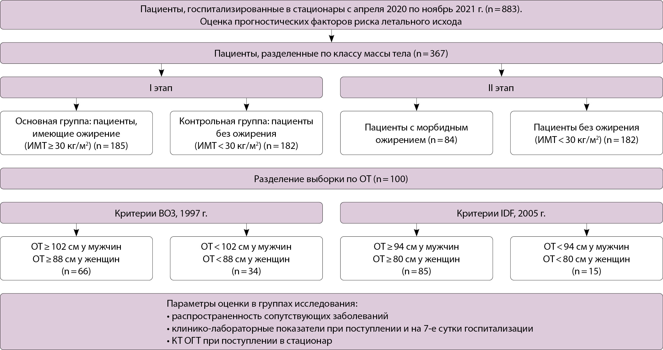 Всего проанализированы 883 участника, у которых верифицированы гипертоническая болезнь (ГБ), хроническая сердечная недостаточность (ХСН), ишемическая болезнь сердца (ИБС), хроническая болезнь почек (ХБП) (скорость клубочковой фильтрации < 60 мл/мин/1,73 м2), онкологические заболевания, болезни органов дыхания и ожирение с ИМТ ≥ 30 без подразделения на степени ожирения, с проведением оценки прогностических факторов риска летального исхода в данной группе. Среди всех участников 382 пациента имели СД 2-го типа, 501 пациент был без СД. Из основной выборки выделены также 367 участников, которые были распределены по классу массы тела в группу с ожирением (ИМТ ≥ 30) – 185 участников и в группу без ожирения (ИМТ < 30) – 182 человека. Дополнительно проводился анализ в группах больных с морбидным ожирением (n = 84) и без ожирения (ИМТ < 30) (n = 182) [12]. Разделение выборки по ОТ на группы осуществлялось согласно критериям Всемирной организации здравоохранения (ВОЗ, 1997) по высокому риску развития метаболических осложнений, связанных с ожирением, а именно: для мужчин ≥ 102 см, для женщин ≥ 88 см [13], а также по критериям Международной федерации диабета (англ. International Diabetes Federation, IDF, 2005): для мужчин ≥ 94 см, для женщин ≥ 80 см [14].