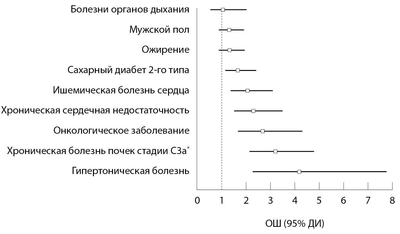 Рис. 2. Влияние сопутствующих заболеваний на риск развития летального исхода при COVID-19; ДИ – доверительный интервал, ОШ – отношение шансов; *скорость клубочковой фильтрации < 60 мл/мин/1,73 м2