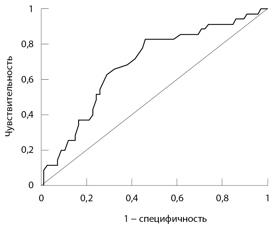 Далее у 100 пациентов был проведен анализ ROC-кривых зависимости вероятности летального исхода от ОТ (см). Данная модель оказалась статистически незначимой (AUC = 0,631 ± 0,07 (95% ДИ 0,49–0,77), p = 0,098). Дальнейшее изучение взаимосвязи тяжести течения COVID-19 от ОТ, с точкой отсечения, равной 101 см, показало высокую вероятность тяжелого течения инфекции (p = 0,002), с характеристиками AUC = 0,69 ± 0,06 (95% ДИ 0,58–0,79), чувствительностью 66%, специфичностью 68% (рис. 4).