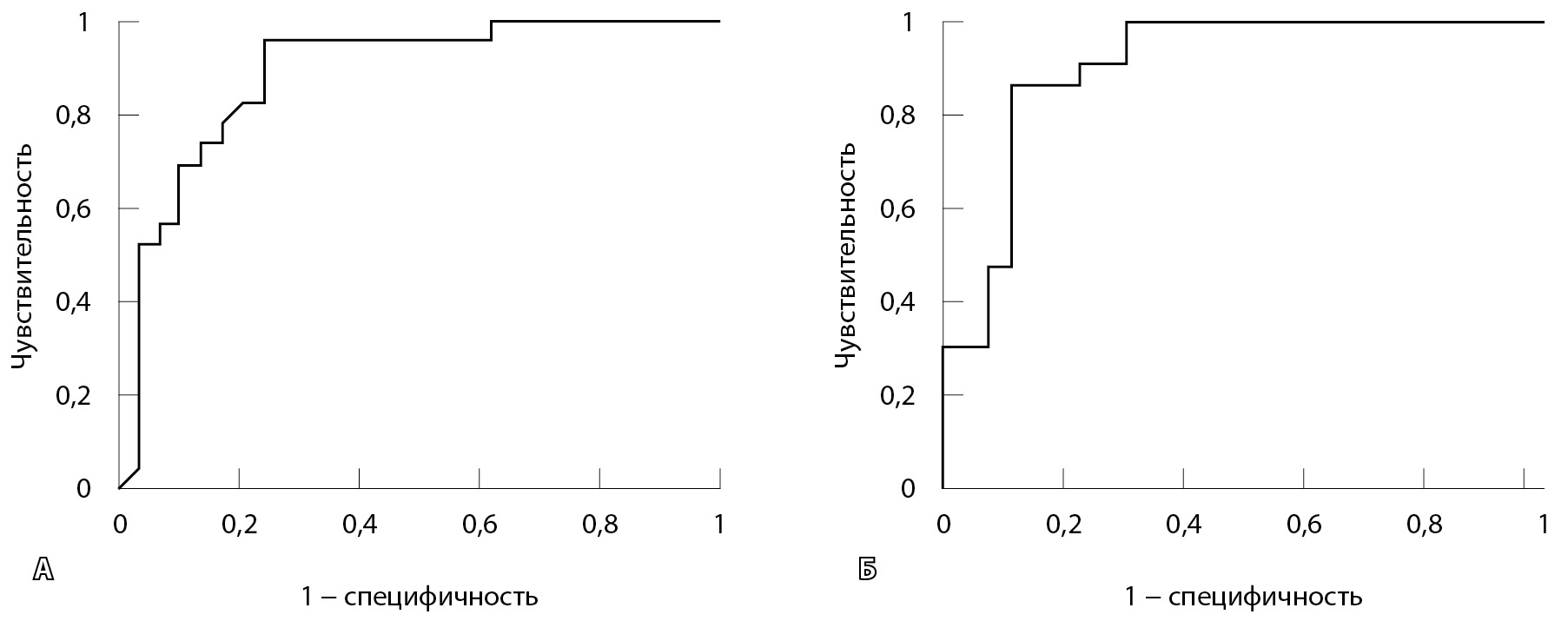 Рис. 3. ROC-кривые при анализе результатов тестирования: А – доминантной руки, Б – недоминантной руки