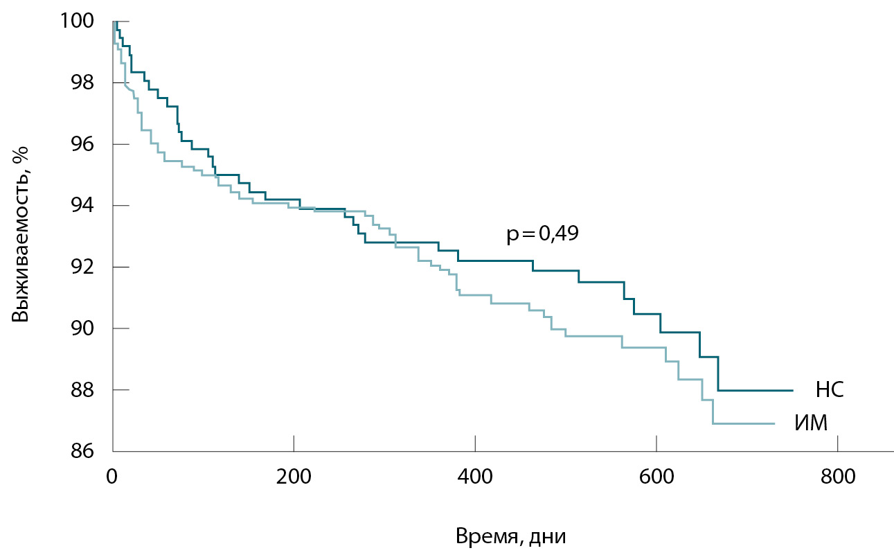 Среди пациентов с НС летальность в отдаленном периоде после выписки из стационара была 9,9% (36 больных). Отсроченная летальность при ИМ составила 10,4% (72 пациента). Отдаленная летальность при НС значимо не отличалась от таковой при ИМ (p = 0,76) (рисунок).