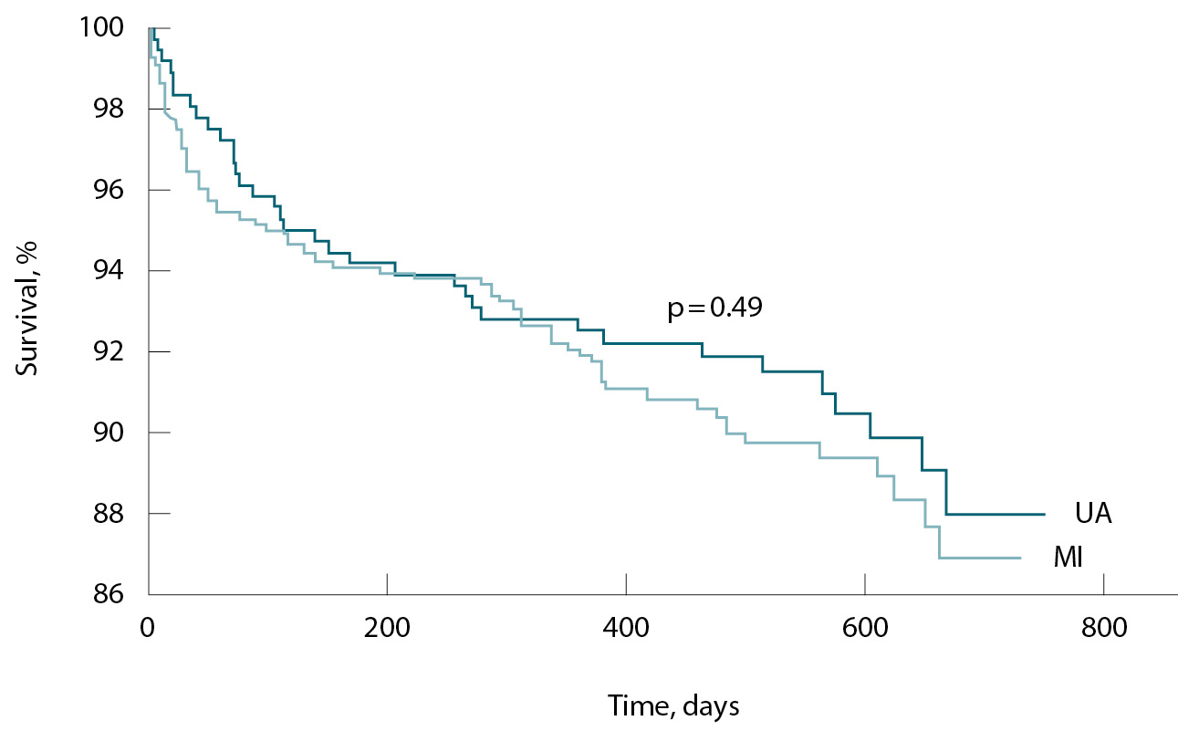 Вместе с тем в ряде работ показана сопоставимая отдаленная летальность после ИМ и НС. В шведском исследовании, включившем 11 944 пациента (пациенты с НС составили 10%), проходивших стационарное лечение по поводу ОКС, спустя 3 года наблюдения летальность была 27,6% (3297 пациентов), при этом статистически значимых различий в частоте смерти среди пациентов с НС и ИМбпST отмечено не было. У больных с ИМбпST регистрировали более высокий риск ИМ и незначительно более низкий риск госпитализации по поводу сердечной недостаточности в сравнении с пациентами с НС [3].