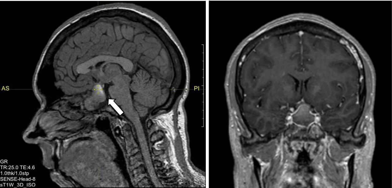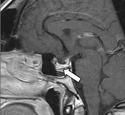 Рис. 3. Магнитно-резонансная томография гипофиза с контрастным усилением. «Пустое» турецкое седло (указано стрелкой)
