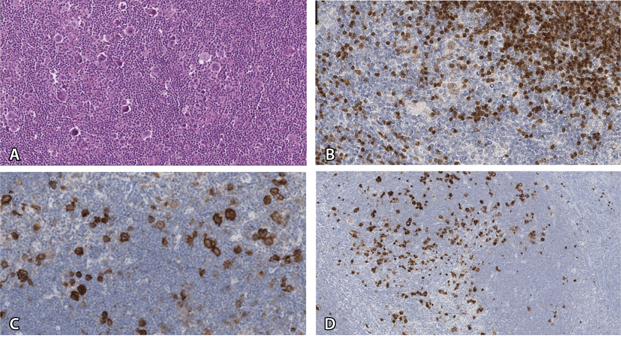 Как уже описано выше, В-клеточная лимфома, богатая Т-клетками, может быть определена по яркой и мономорфной экспрессии CD20 в крупных опухолевых клетках. Опухолевые клетки этой лимфомы также экспрессируют другие В-клеточные маркеры, включая белок 6 В-клеточной лимфомы (BCL-6), и не экспрессируют CD15 и CD30, что четко исключает диагноз ЛХ в этом случае. Опухолевое микроокружение данной лимфомы гетерогенно и представлено различными субпопуляциями Т-клеток [14].