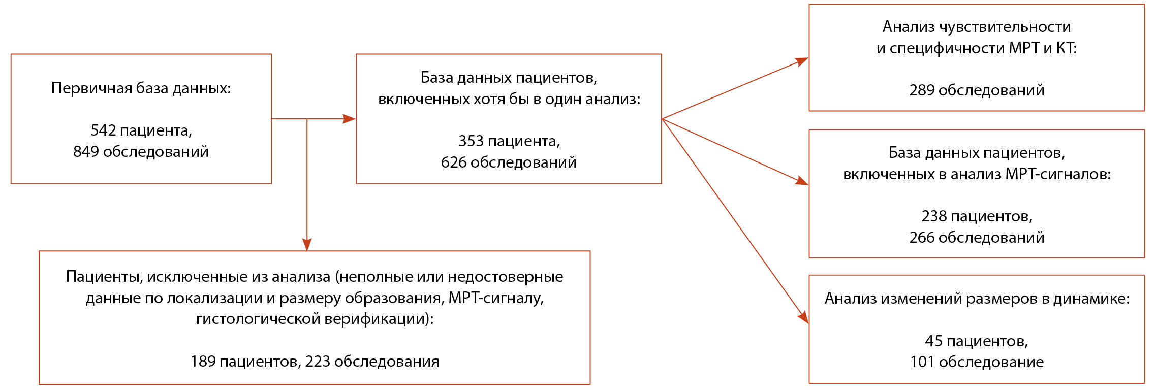 После первичной обработки базы данных из анализа были исключены 189 пациентов (223 исследования), у которых отсутствовало одно из перечисленного: точные данные по локализации, размеру, МР-сигналу или гистологическая верификация. Итого, хотя бы в один из этапов анализа вошли 353 пациента (626 обследований) (рис. 1).