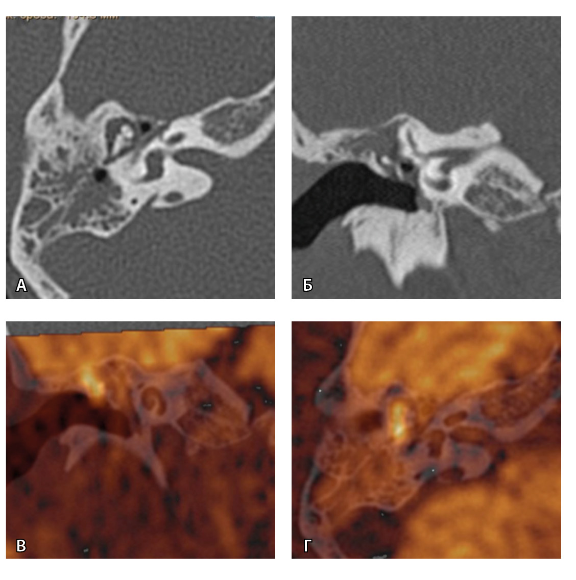 Рис. 3. Хронический правосторонний средний отит. По данным компьютерной томографии (А, Б) нет ремоделирования барабанной полости, деструкции и смещения косточек, скутум сохранен, данных за холестеатому нет. При магнитно-резонансной томографии (В, Г) у того же пациента выявлен очаг высокого магнитно-резонансного сигнала, который при слиянии локализовался в области пространства Пруссака. Заключение и интраоперационно – холестеатома пространства Пруссака