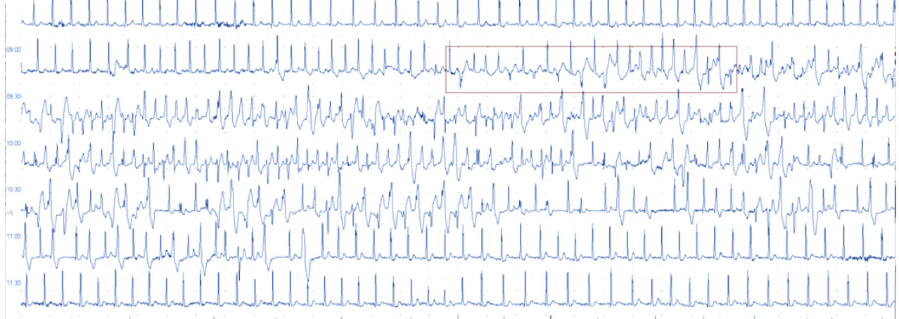 Fig. 1. A fragment of the 24-hour electrocardiographic monitoring: background sinus tachycardia with a heart rate of 121 bpm and polymorphic ventricular extrasystoles with transformation into polymorphic ventricular tachycardia (the beginning of the episode in the red frame), with subsequent bidirectional ventricular tachycardia of 6 sec duration; later on, bidirectional ventricular tachycardia gives way bigeminal ventricular extrasystoles and restoration of the sinus rhythm with a heart rate of 100 bpm