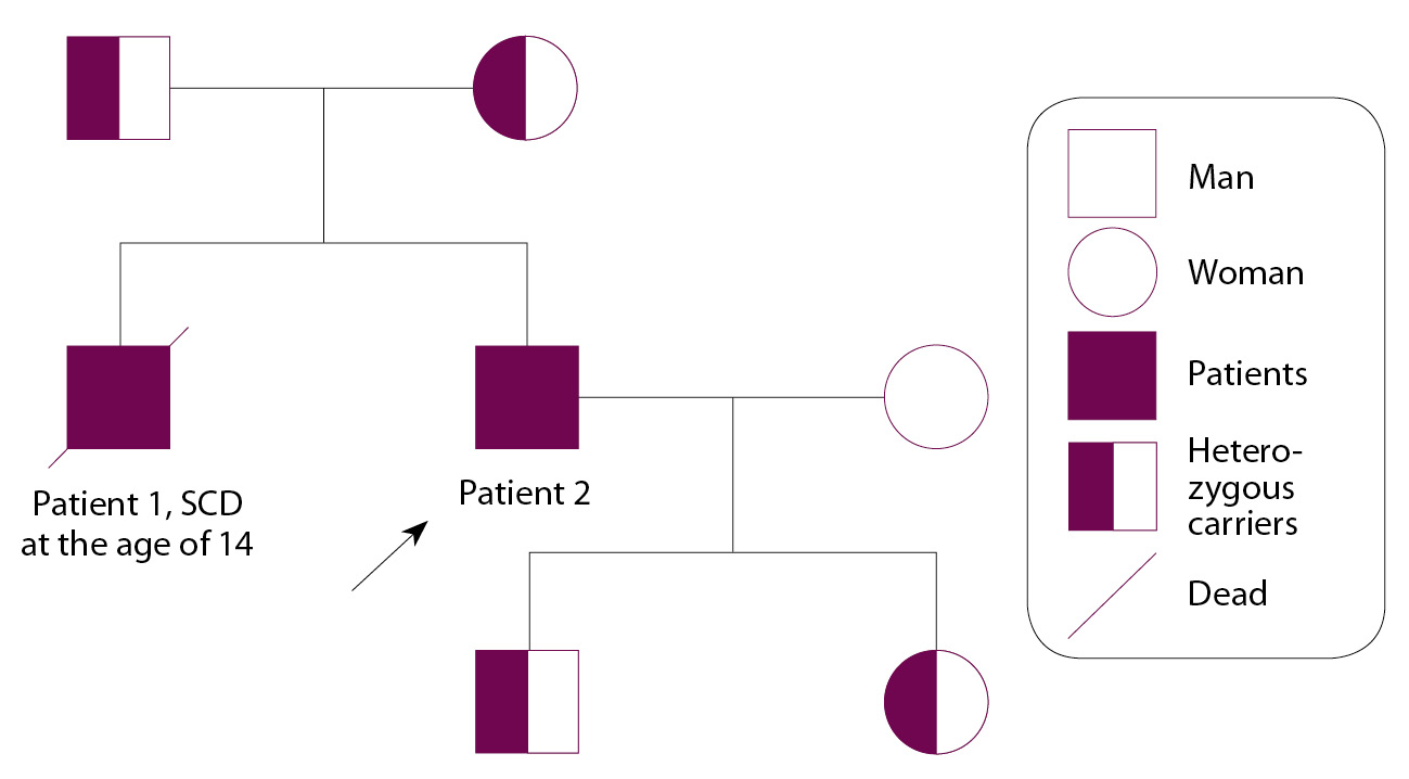 Fig. 2. The genealogy of the patients 1, 2 (family 1); SCD, sudden cardiac death