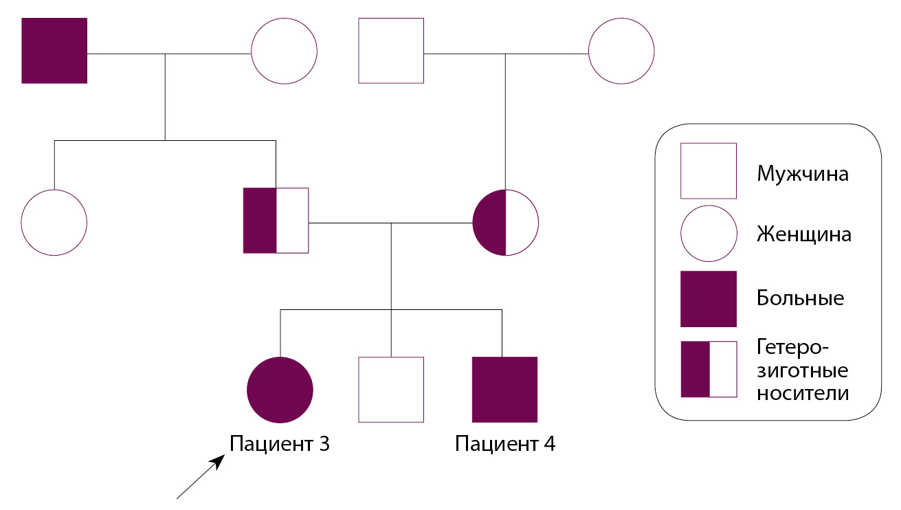 The girl (Patient 3) was referred to our hospital at the age of 6 years due to registered asymptomatic episodes of unstable bidirectional ventricular tachycardia according to Holter monitoring, with heart rate exceeding 160 bpm. After diagnosis establishment, specific antiarrhythmic therapy was initiated for primary prevention of life-threatening rhythm disturbances and syncopal episodes – atenolol at a dose of 1.3 mg/kg/day, subsequently titrated to 2 mg/kg/day. During beta-adrenergic blocker therapy, Holter monitoring and treadmill stress test showed frequent polymorphic single and paired ventricular extrasystoles, episodes of polymorphic ventricular tachycardia, as well as brief episodes of supraventricular (nodal) tachycardia. This prompted the addition of a second antiarrhythmic drug – propafenone – at a dose of 7 mg/kg/day. Despite regular administration of combined antiarrhythmic therapy, syncope occurred at the age of 9 years during emotional stress (while doing school homework). To prevent the development of SCD, a surgical intervention was performed – video-assisted thoracoscopic left cardiac sympathetic denervation. Over the course of two years post-surgery, no syncopal episodes were observed, and ventricular and supraventricular rhythm disturbances were not registered in control Holter monitoring and treadmill stress tests. As part of the familial cascade screening, asymptomatic relatives of the patient were evaluated. The mother and one of the brothers did not show any rhythm disturbances on Holter monitoring, including after adequate physical stress. In the youngest brother (Patient 4), Holter monitoring indicated polymorphic single and paired ventricular extrasystoles, as well as episodes of polymorphic ventricular tachycardia. Consequently, the diagnosis of CPVT was established, and specific antiarrhythmic therapy was initiated. The pedigree of Patients 3 and 4 is shown in Figure 3.