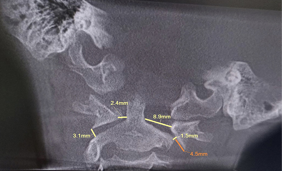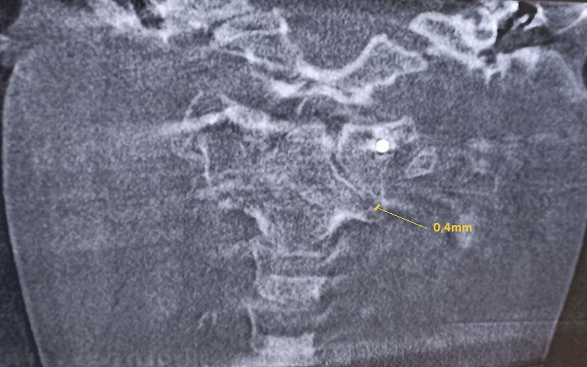 Пациент В. 9 лет обратился с жалобами на боли и вынужденное положение головы в виде наклона вправо. Из анамнеза, со слов матери, данное состояние возникло на фоне проведенной эндоскопической аденотомии и тимпаноскопии справа около 3 недель назад. На 2-е сутки после проведенного вмешательства, со слов матери, у ребенка появилось вынужденное положение головы в виде наклона вправо и постоянные боли постепенного нарастающего характера по боковой поверхности шеи справа. По данному поводу спустя 7 дней мальчик был консультирован у оперирующего хирурга, который расценил данную ситуацию как допустимые изменения послеоперационного характера. В связи с отсутствием очевидных улучшений мать ребенка приняла решение о необходимости обращения к врачу травматологу-ортопеду. При первичном осмотре ребенка отмечался вынужденный наклон головы вправо до угла в 54°, боли при пальпации по боковой поверхности шеи справа (6-7 баллов по Визуально-аналоговой шкале). Пассивные движения в шейном отделе позвоночника были представлены безболезненным наклоном вперед в пределах 10°, наклоном назад в пределах 3°, наклонами вправо и влево в пределах 5°. Активные движения в шейном отделе позвоночника были представлены в виде безболезненного наклона вперед в пределах 15°, назад в пределах 5-7°, наклонов вправо и влево в пределах 7–10 градусов. Превышение представленных объемов пассивных и активных движений вызывало усиление болей, ротационные движения осуществить не удалось. По остальным отделам костно-мышечной системы отклонения не выявлены. С учетом клинической картины было принято решение выполнить КЛКТ, по результатам которой зафиксировано следующее: ротация атланта вправо вокруг вертикальной оси без передней дислокации. Рентгеновская щель срединного атлантоаксиального сустава не расширена, равна 2,5 мм, что соответствует возрастной норме. Суставные рентгеновские щели латеральных атлантоаксиальных суставов асимметричны: справа 3,1 мм, слева 1,5 мм. Расстояние между медиальными краями боковых масс атланта и зубом аксиса: справа – 2,4 мм, слева – 8,9 мм (рис. 1). Определяется боковое смещение атланта влево: нижняя суставная поверхность левой боковой массы атланта смещена на 4,5 мм влево относительно суставной поверхности аксиса.
