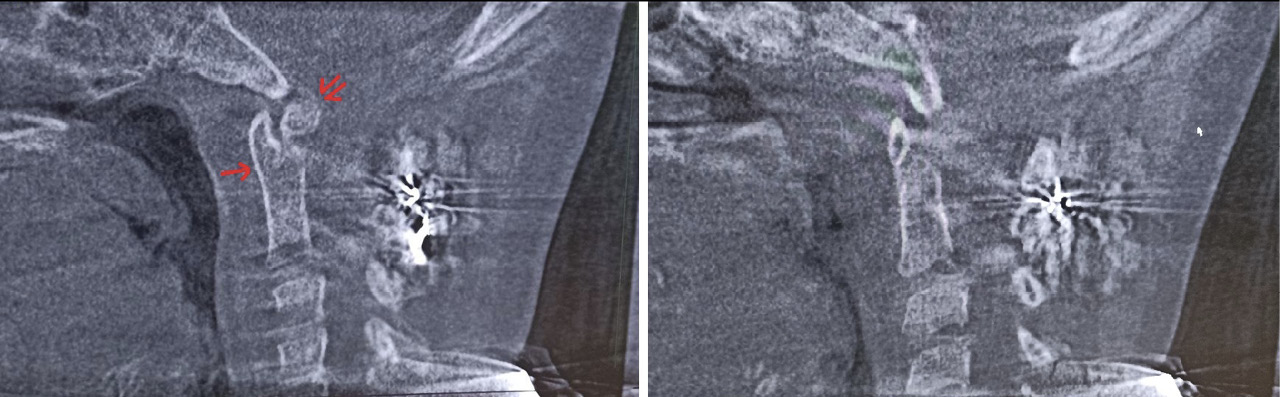 Рис. 7. Конусно-лучевая компьютерная томография краниовертебральной области, сагиттальный срез (А), парасагиттальный срез (Б). Стрелкой отмечено место анкилоза срединного атлантоаксиального сустава. Двойной стрелкой обозначен свободно лежащий апикальный костный фрагмент зубовидного отростка аксиса