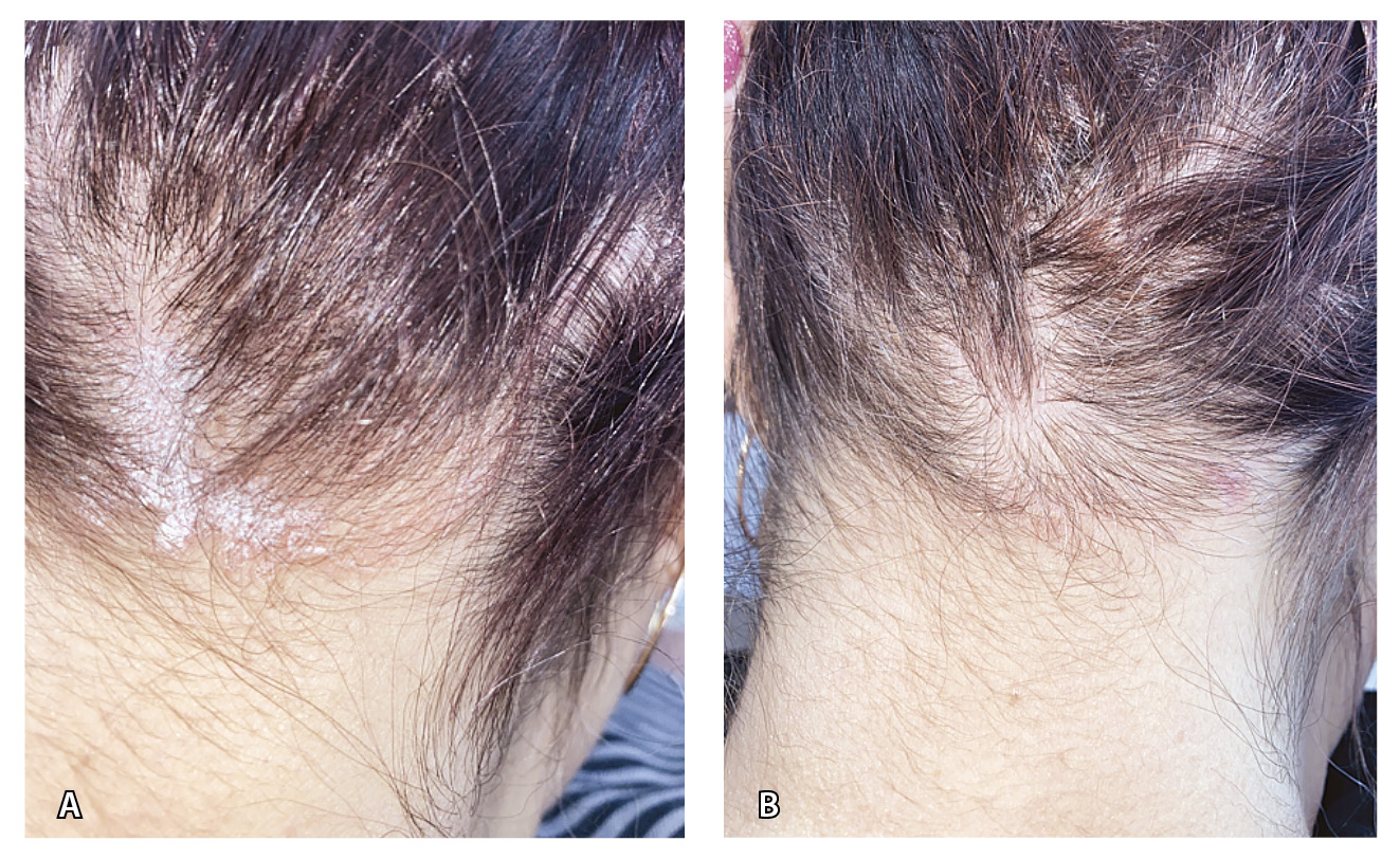 Рис. 2. Псориазиформный очаг на волосистой части головы: А – до лечения, Б – состояние после лечения