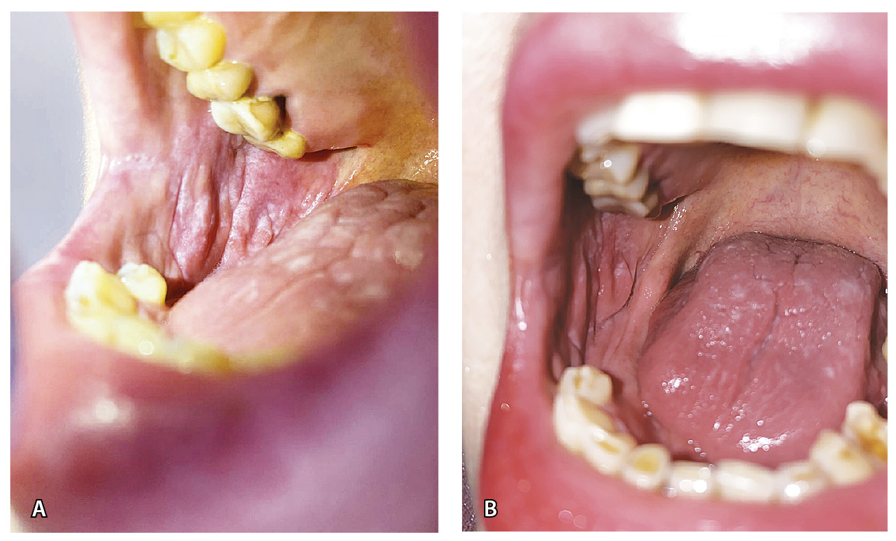 Рис. 5. Лихеноидные высыпания на слизистой оболочке полости рта и языка (правая щека): А – до лечения, Б – после лечения