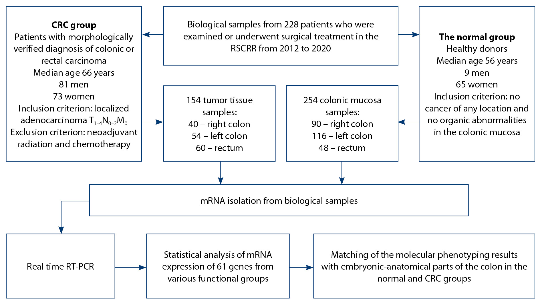 Проведено экспериментальное ретроспективное исследование молекулярных фенотипов (уровни экспрессии мРНК определенных генов) эмбрионально-анатомических отделов ТК в норме и при КРР (образцы нормальной слизистой оболочки ТК и аденокарциномы). Всего в исследовании использовано 408 образцов, полученных от 228 человек, которые проходили обследование или лечение в ФГБУ «Российский научный центр рентгенорадиологии» Минздрава России (РНЦРР) с 2012 по 2020 г. Информация для формирования базы медицинских данных участников исследования получена из информационной системы РНЦРР. Критерием включения образцов нормальной ткани в исследование было отсутствие онкологических заболеваний любой локализации и органических изменений слизистой ТК (условно здоровые доноры). Критерием включения образцов аденокарциномы было наличие локализованной стадии T1–4N0–2M0 аденокарциномы ободочной или прямой кишки в отсутствие неоадъювантной лучевой и химиотерапии (пациенты). Критерием невключения служили стадии TлюбаяNлюбаяM1 или T1–4N0–2M0 в случае получения неоадъювантной лучевой или химиотерапии.