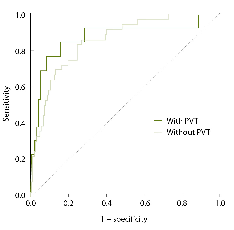 Fig. 2. ROC curves for the models for the outcome “platelet count ≥ 150 × 109/L” in the patients with liver cirrhosis with and without portal vein thrombosis (PVT)
