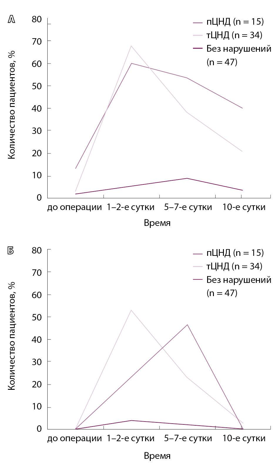 После операции больший 3-часовой объем потребленной (введенная + выпитая) жидкости отмечался на 1–2-е сутки у пациентов с пЦНД по сравнению с группой БН (табл. 1). Различий между группами по выделению жидкости за 3 часа не было. Выявлено большее суточное потребление жидкости в первые сутки после операции у пациентов с пЦНД и тЦНД по сравнению с группой БН, тенденция к различиям групп сохранялась на 1–2-е сутки после операции. Суточный диурез в сутки операции и на 5–7-е сутки после нее у пациентов с пЦНД и тЦНД был больше, чем в группе БН, при этом тенденция к различиям групп отмечалась и в 1–2-е сутки.