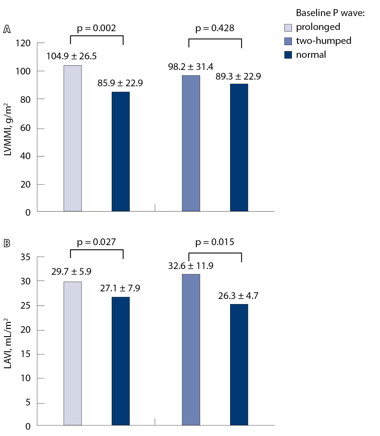 При оценке прогностической значимости исходных нарушений ЭКГ в отношении динамики показателей ЭхоКГ после ВДХТ с аутоТГСК установлено, что у пациентов с исходно удлиненным зубцом Р (> 110 мс) чаще обнаруживалось увеличение ИММЛЖ (ОШ 4,179; 95% ДИ 1,425–12,250; p = 0,015). Исходно двугорбый зубец Р предсказывал увеличение ИОЛП (ОШ 19,231; 95% ДИ 2,064–179,212; p = 0,004) после проведенной ВДХТ с аутоТГСК. На рисунке отражены показатели ИММЛЖ и ИОЛП после лечения в зависимости от исходного изменения зубца P, при этом связи других показателей ЭКГ с изменением ЭхоКГ не выявлено.