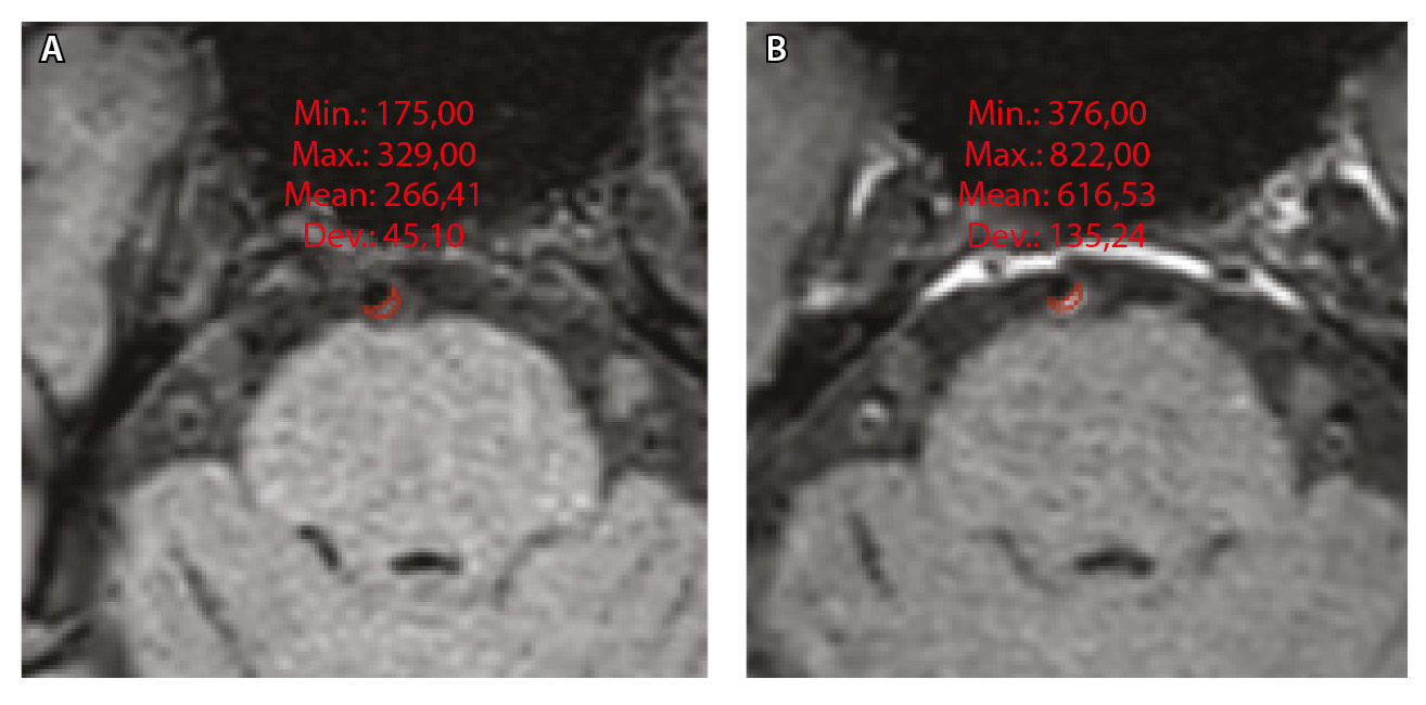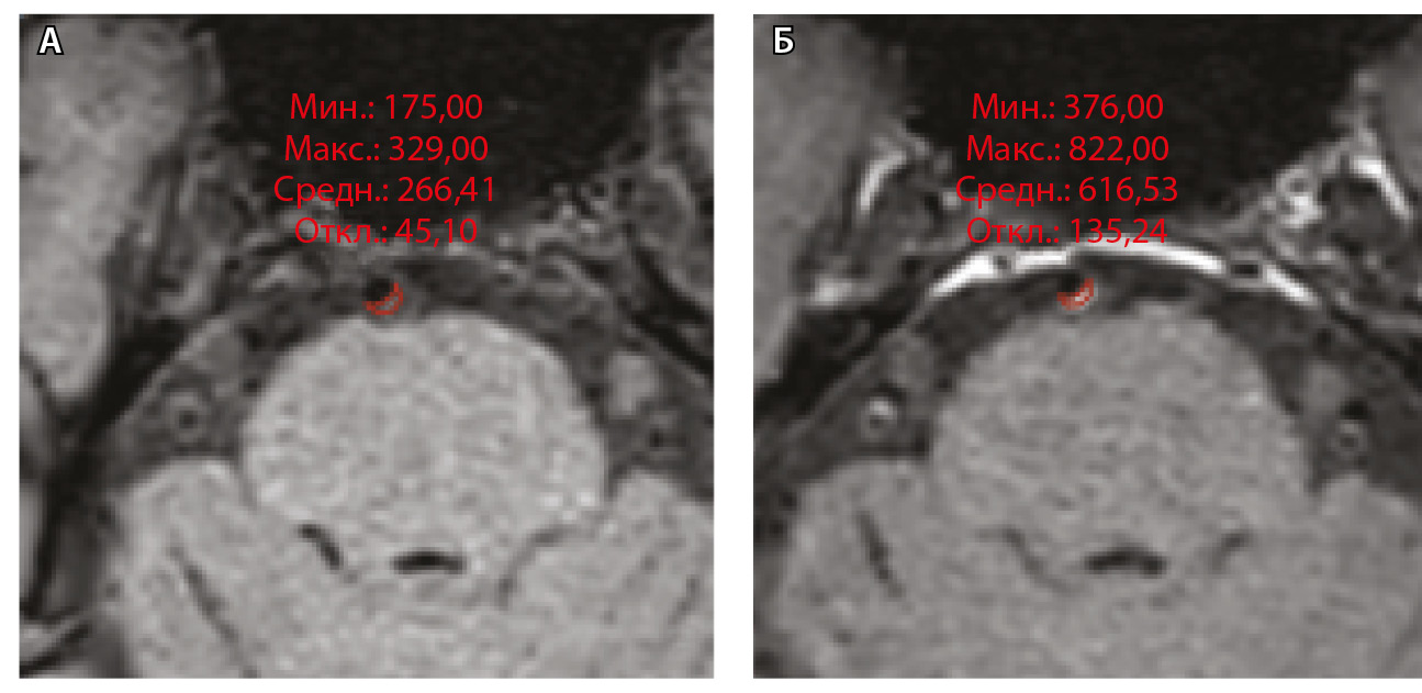 Рис. 1. Пример измерения интенсивности эхо-сигнала от атеросклеротической бляшки базилярной артерии для расчета индекса усиления контрастности стенки сосуда (WEI). В месте максимального стеноза артерии на одном срезе отмечали область интереса (ROI) и регистрировали среднее значение интенсивности сигнала от сосудистой стенки (SIwall). ROI были сопоставлены по размеру и местоположению в наборе данных T1-TSE-db-FS до (А) и после (Б) контрастного усиления; макс. – максимум, мин. – минимум, откл. – отклонение, средн. – среднее