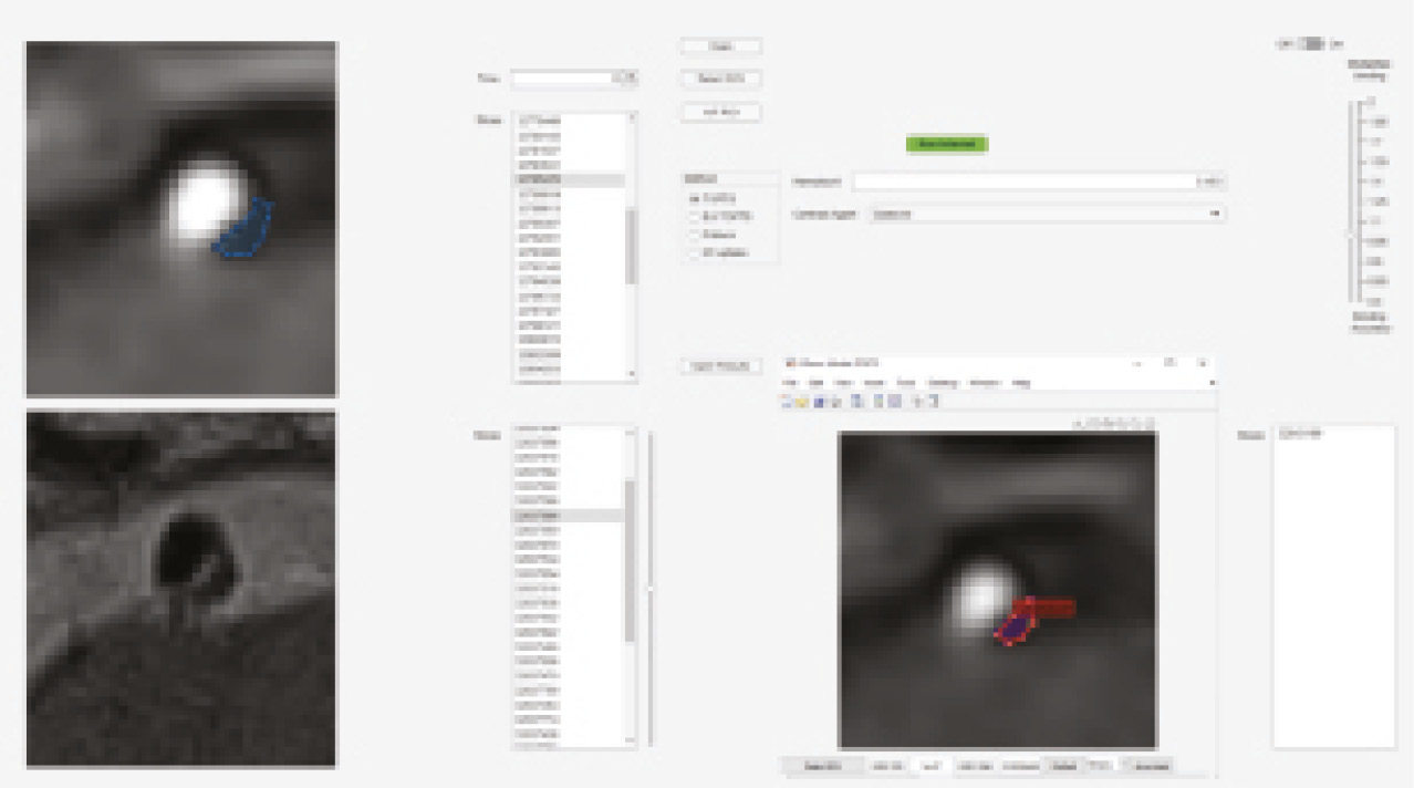 Рис. 2. Интерфейс диагностической рабочей станции: пример постобработки данных магнитно-резонансной томографии с динамическим контрастным усилением (ДКУ) c получением количественных показателей (Ktrans, vp, ve). Данные ДКУ корегистрируются со структурными HR T2-TSE-изображениями, на соответствующих срезах размечается область интереса (ROI) в атеросклеротической бляшке. В расчетах учитываются показатели гематокрита и релаксивности контрастного препарата