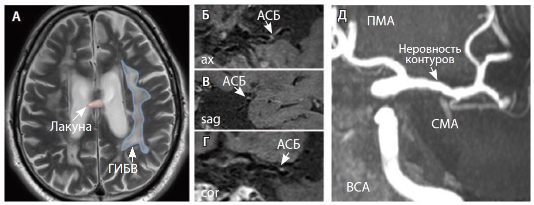 Рис. 3. Пациент Ц., 53 года, с признаками церебральной микроангиопатии (F3 по шкале Fazekas), атеросклерозом интракраниальных артерий, без формирования гемодинамически значимых стенозов. А – магнитно-резонансная томография (МРТ) головного мозга, режим Т2-взвешенного изображения: видны обширные сливные зоны гиперинтенсивности белого вещества (ГИБВ) с наличием на этом фоне лакунарных инфарктов; Б, В, Г – МРТ сосудистой стенки, режим T1-TSE-db-FS после контрастного усиления: в сегменте М1 левой средней мозговой артерии (СМА) визуализируется эксцентричная атеросклеротическая бляшка (АСБ), интенсивно накапливающая контрастный препарат; Д – трехмерная магнитно-резонансная времяпролетная (3D ToF) ангиография: выявляется неровность контуров левой СМА в сегменте М1; ax – аксиальная, sag – сагиттальная, cor – коронарная плоскости; ВСА – внутренняя сонная артерия; ПМА – передняя мозговая артерия