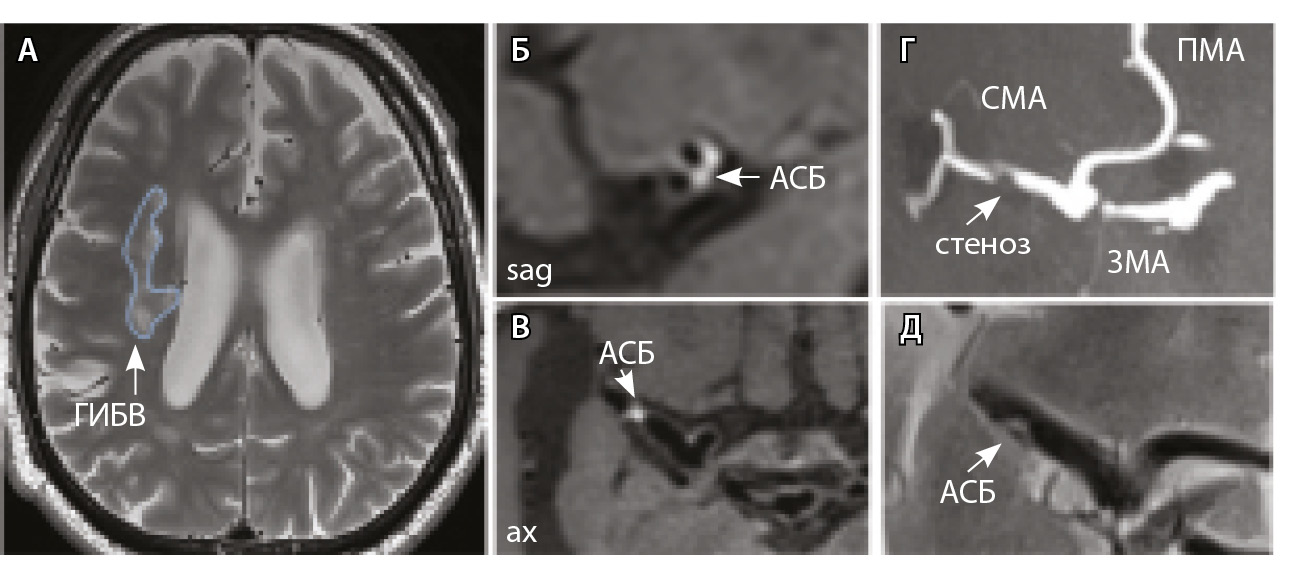 Рис. 4. Пациент К., 69 лет, с признаками церебральной микроангиопатии (F2 по шкале Fazekas) и атеросклерозом интракраниальных артерий, с формированием гемодинамически значимого стеноза в сегменте М1 правой средней мозговой артерии (СМА): А – магнитно-резонансная томография (МРТ), режим Т2-взвешенного изображения: видны множественные сливные очаги гиперинтенсивности белого вещества (ГИБВ); Б, В – МРТ сосудистой стенки, режим T1-TSE-db-FS после контрастного усиления: в сегменте М1 правой СМА визуализируется эксцентричная атеросклеротическая бляшка (АСБ), интенсивно накапливающая контрастный препарат; Г – трехмерная магнитно-резонансная времяпролетная (3D ToF) ангиография: виден стеноз правой СМА в сегменте М1; Д – режим HR Т2-TSE: видна АСБ в сегменте М1 правой СМА; ax – аксиальная, sag – сагиттальная плоскости; ЗМА – задняя мозговая артерия; ПМА – передняя мозговая артерия