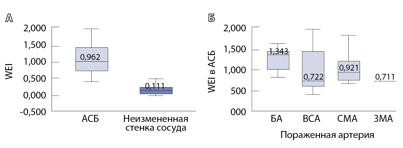 Рис. 5. Значения индекса контрастного усиления сосудистой стенки (WEI): А – в атеросклеротической бляшке (АСБ) и неизмененной стенке, Б – в АСБ в различных артериях; БА – базилярная артерия, ВСА – внутренняя сонная артерия, ЗМА – задняя мозговая артерия, СМА – средняя мозговая артерия