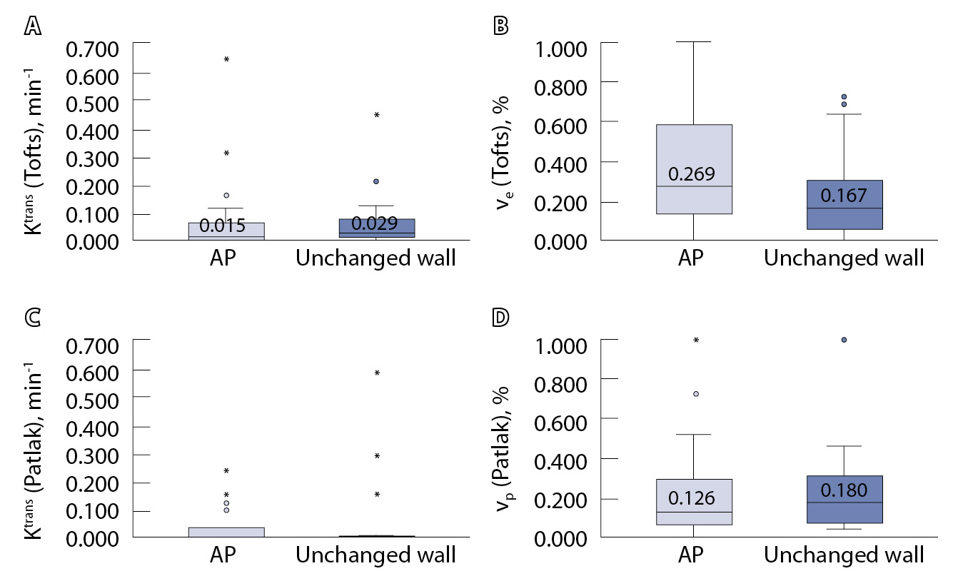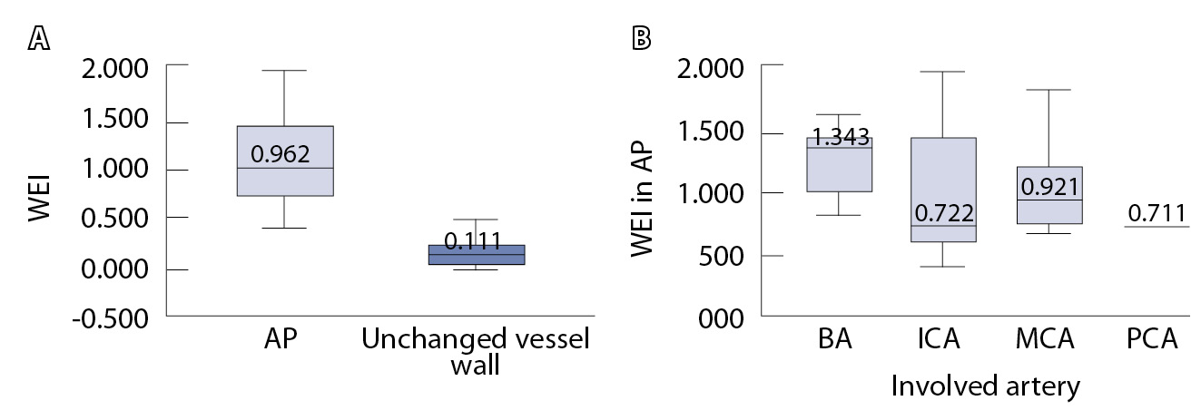 Results: There were significant differences in WEI in AP and in unchanged wall (0.962 [0.686; 1.387] vs. 0.111 [0.014; 0.206], p < 0.001). No significant differences were found between WEI values in internal carotid arteries APs (0.722 [0.573; 1.580]), middle cerebral arteries (0.921 [0.725; 1.183]), and basilar artery (1.343 [1.002; 1.419]) (p = 0.381). We also found significant difference (p = 0.034) in the extravascular extracellular fraction volumes ve (Tofts) in AP located in the basilar artery (0.171 [0.146; 0.325]), internal carotid arteries (0.579 [0.358; 1.000]), and middle cerebral arteries (0.134 [0.101; 0.269]).