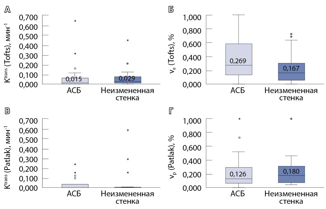 Рис. 6. Значения проницаемости стенок сосудов Ktrans, рассчитанные в модели Tofts (А) и Patlak (В), фракционного объема внесосудистого внеклеточного пространства ve – модель Tofts (Б), фракционного объема микрососудов vp – модель Patlak (Г) в зависимости от локализации в атеросклеротической бляшке (АСБ) и в неизмененной стенке