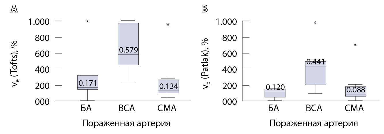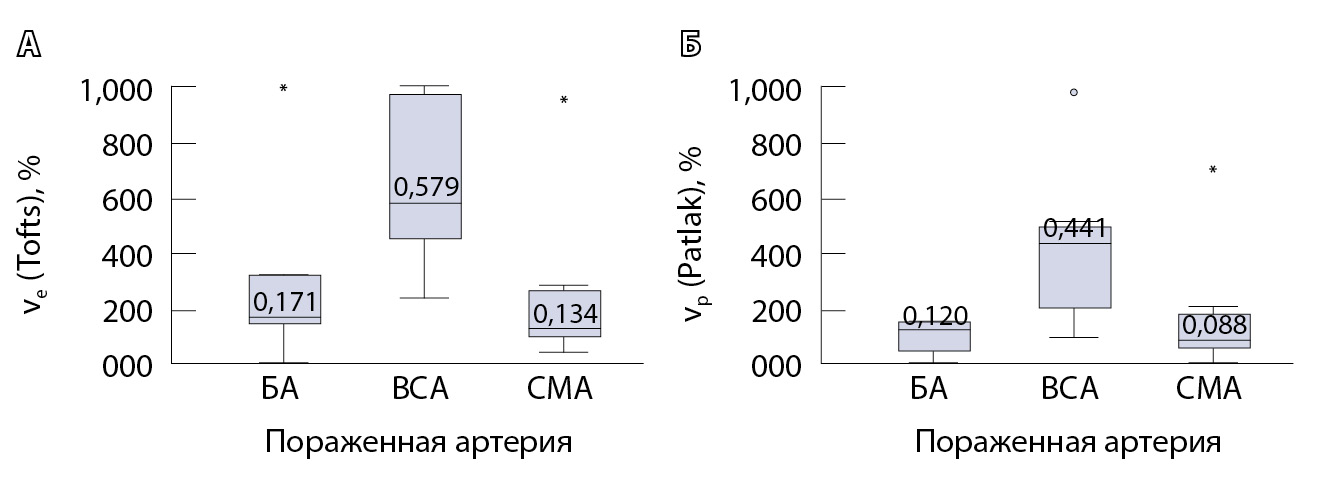 Вместе с тем в проведенном исследовании были установлены значимые различия фракционных объемов внесосудистого внеклеточного пространства ve (Tofts) в АСБ при поражении различных артерий: БА – 0,171 [0, 146; 0, 325], СМА – 0,134 [0, 101; 0, 269], ВСА – 0,579 [0, 358; 1, 000] (рис. 7). Апостериорные сравнения не выявили различий между парами групп, что может быть связано со строгостью поправки на множественные сравнения. Тем не менее отмечалась тенденция к более высокому значению ve (Tofts) при поражении ВСА (0,579 против 0,134 в БА и 0,171 в СМА).