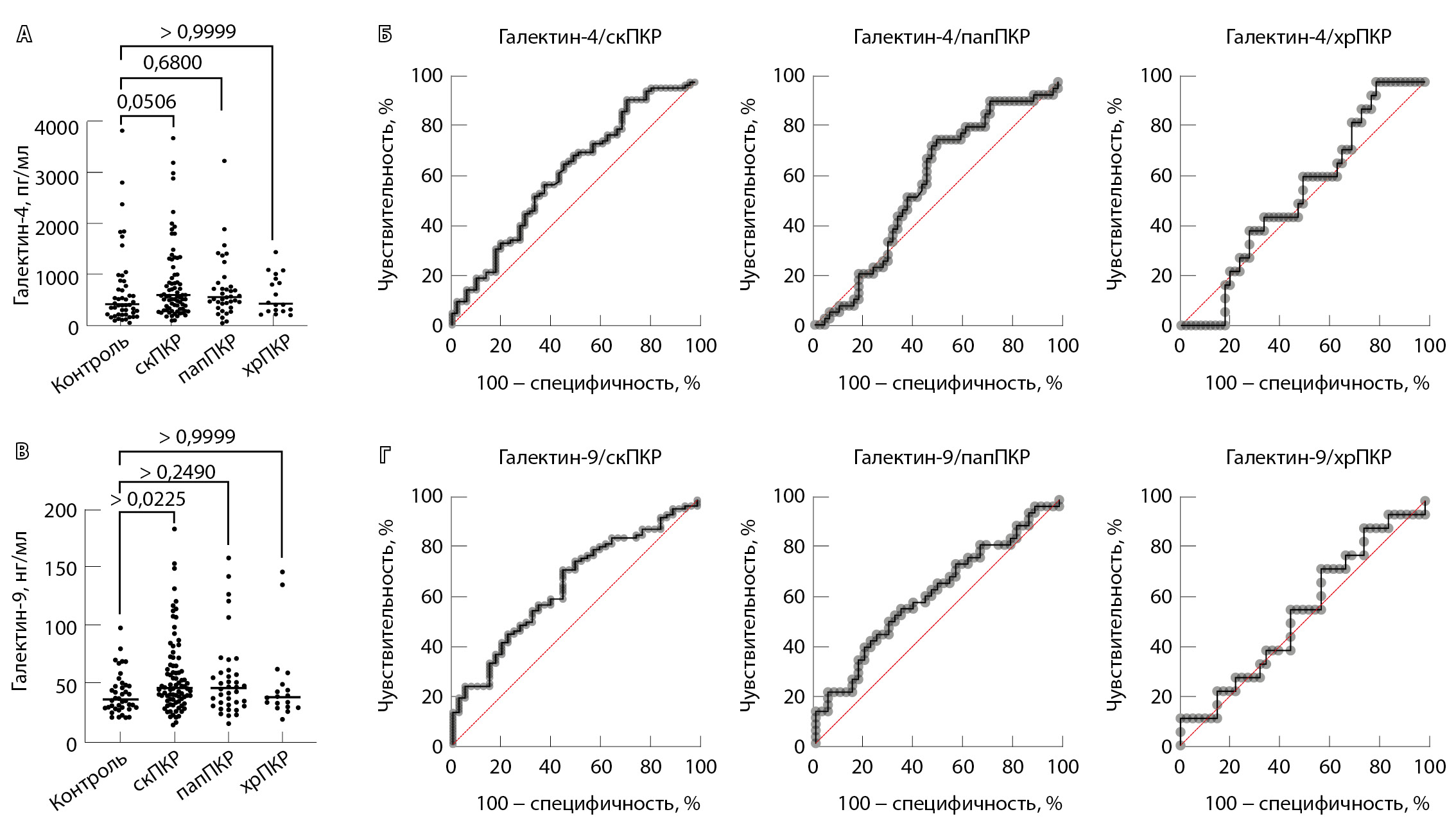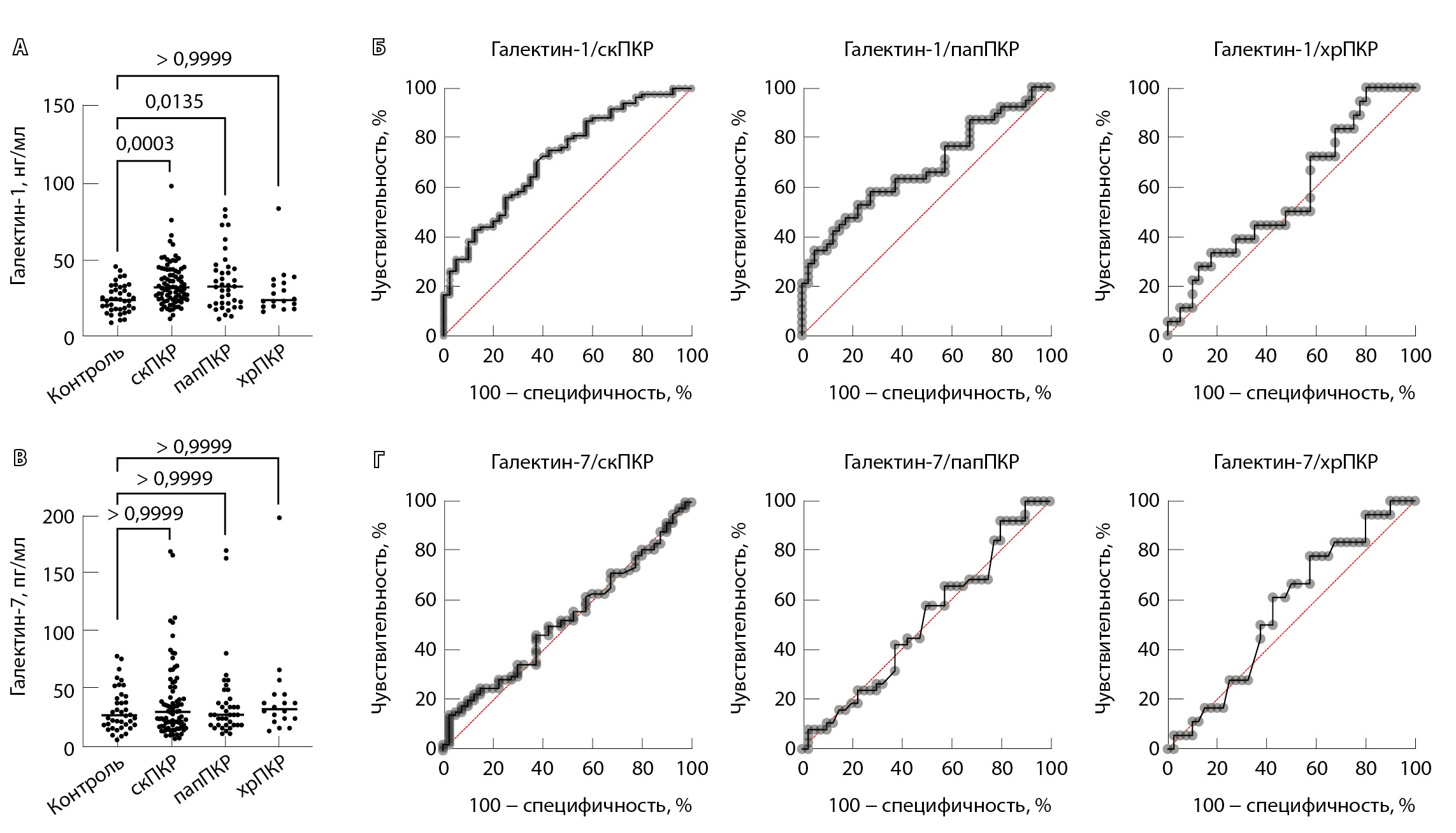 Рис. 1. Сравнительный анализ содержания в сыворотке крови больных почечно-клеточным раком (ПКР) и здоровых доноров галектина-1 (А) и -7 (В). ROC-анализ для галектина-1 (Б) и -7 (Г) у больных ПКР различных гистологических типов: для галектина-1 AUC = 0,721 (p < 0,0001) для светлоклеточного ПКР (скПКР), 0,673 (p = 0,0086) – для папиллярного ПКР (папПКР) и 0,576 (p = 0,355) – для хромофобного ПКР (хрПКР); для галектина-7 AUC = 0,527 (p = 0,634) для скПКР; 0,513 (p = 0,845) – для папПКР и 0,566 (p = 0,425) – для хрПКР