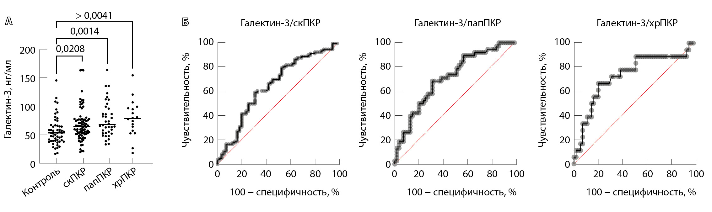Провели анализ содержания галектинов -1 и -7 в сыворотке крови больных ПКР в сравнении со здоровыми донорами (рис. 1). Содержание галектина-1 в сыворотке крови было выше у больных скПКР и папПКР по сравнению со здоровыми донорами, однако площадь под ROC-кривой, равная 0,721 для скПКР и 0,673 для папПКР, свидетельствует о среднем качестве модели, что не позволяет использовать полученные данные в диагностических целях. Для галектина-7 не выявлено различий в содержании данного белка между группами контроля и больных ПКР.
