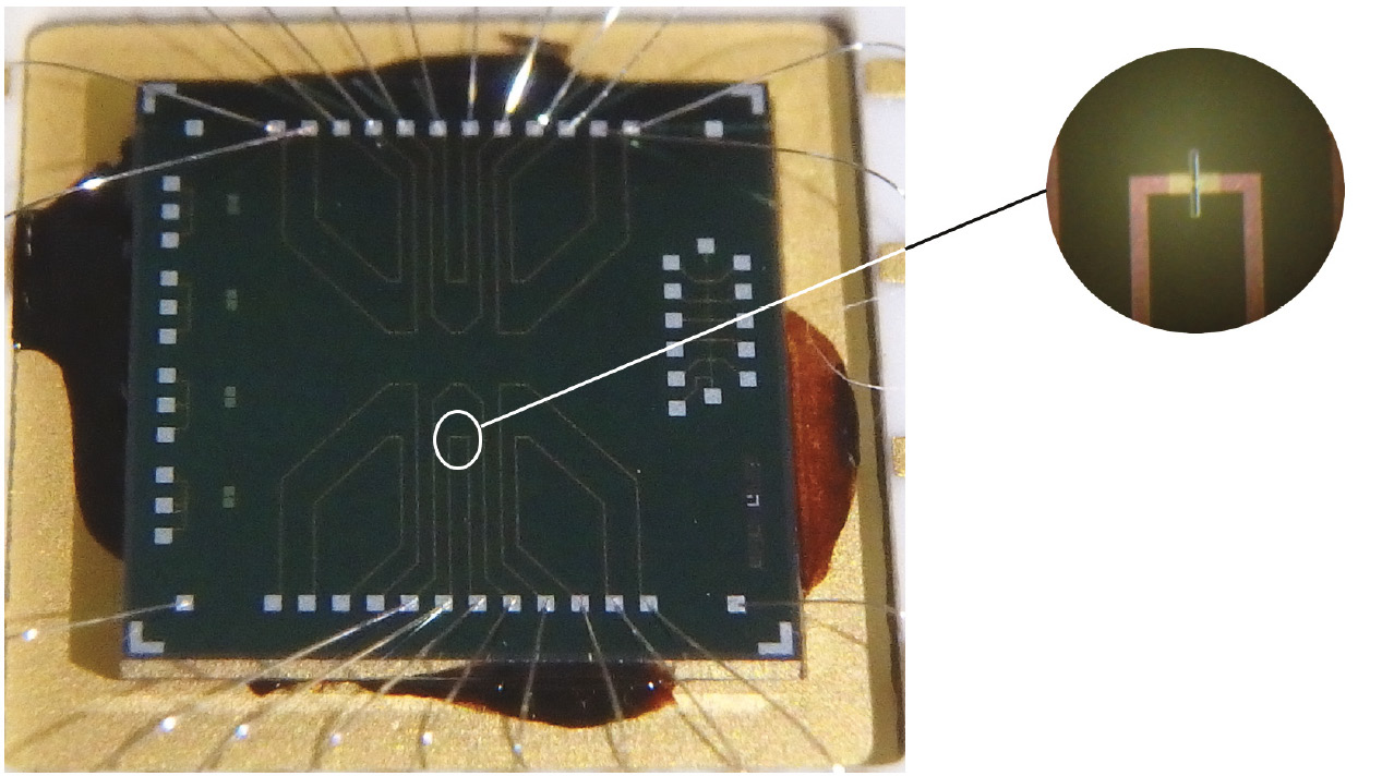 Рис. 1. Поверхность нанопроводного чипа. На выноске показано увеличенное оптическое изображение чувствительного элемента чипа (нанопровода)