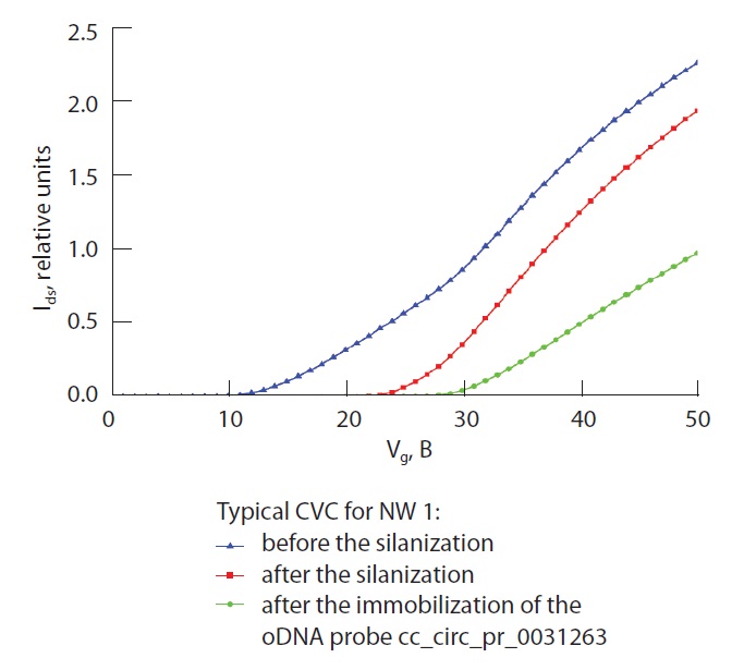 Типичные кривые ВАХ, полученные в экспериментах, приведены на рис. 2: мы наблюдали смещение ВАХ в сторону более высоких значений напряжения на затворе (Vg) как после силанизации НП-чипа, так и после иммобилизации оДНК-зондов на поверхности НП (между его контактами). Данный факт подтверждает эффективность иммобилизации оДНК-зондов и позволяет использовать НП-чип в экспериментах по детекции целевых кольцРНК.