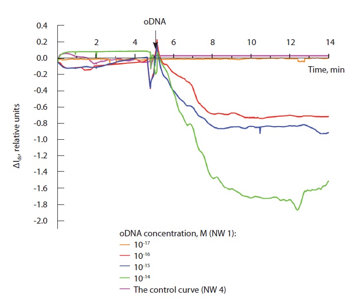 Как видно на рис. 3, при добавлении растворов синтетических оДНК с концентрациями от 10-16 до 10-14 М сигнал от чувствительных элементов НП-чипа уменьшается (кривые идут вниз) и уровень сигнала, как и ожидалось, увеличивается по абсолютной величине (модулю). При этом с уменьшением концентрации модельного оДНК наблюдался меньший уровень сигнала. При концентрации модельного оДНК 10-17 М сигнал был сопоставим с уровнем контрольного сигнала. Можно сделать вывод о том, что концентрационный предел обнаружения целевых биомолекул (минимальная детектируемая их концентрация) составил 10-16 М.