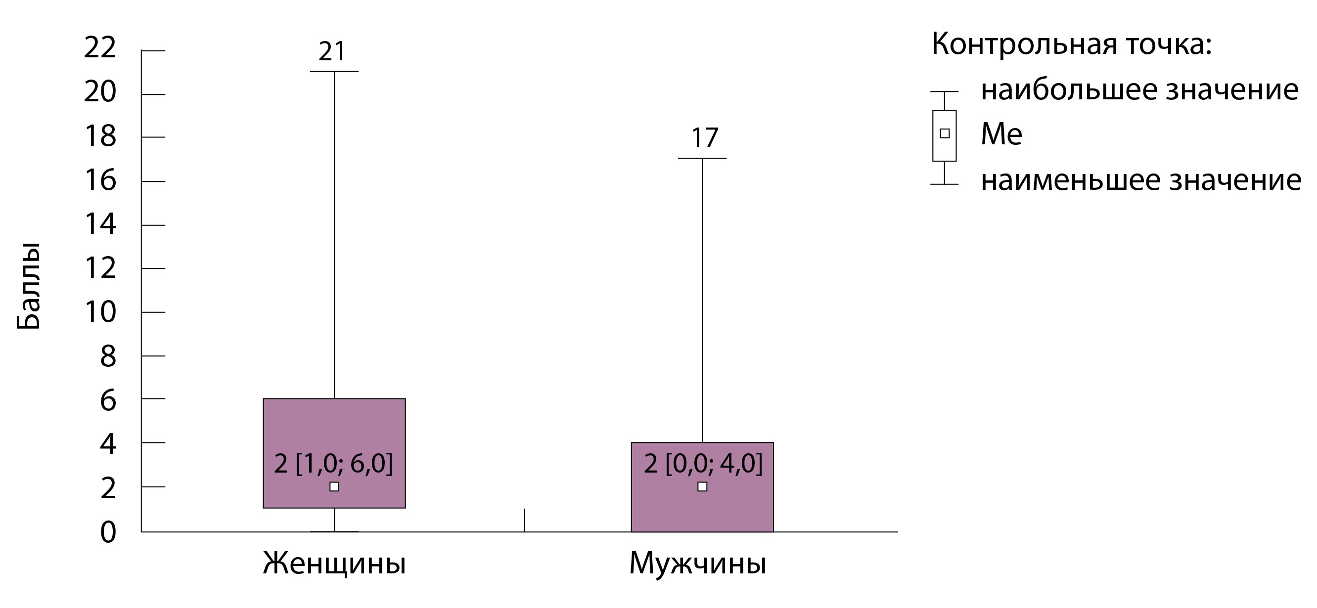 Выбраны 2 показателя – пол и уровень образования, при оценке которых мы предполагали установить отсутствие связи между баллом за опросник и ответом на соответствующий вопрос анкеты. Для оценки дискриминативной валидности пациенты были разделены на 2 группы: мужчины (n = 419) и женщины (n = 408). Получено ненормальное распределение балла за тест (p < 0,05, критерий Шапиро – Уилка). Для оценки этого типа валидности использовали сумму баллов без учета дополнительного вопроса для женщин. Как видно на рис. 1, в выборках мужчин и женщин была одинаковая медиана балла, однако генеральные совокупности отличались (р = 0,000083, критерий Манна – Уитни).