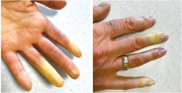 Изменение окраски (побеление, посинение, синюшность) кожных покровов кистей или стоп на холоде, как представлено на фото Нет Да | |