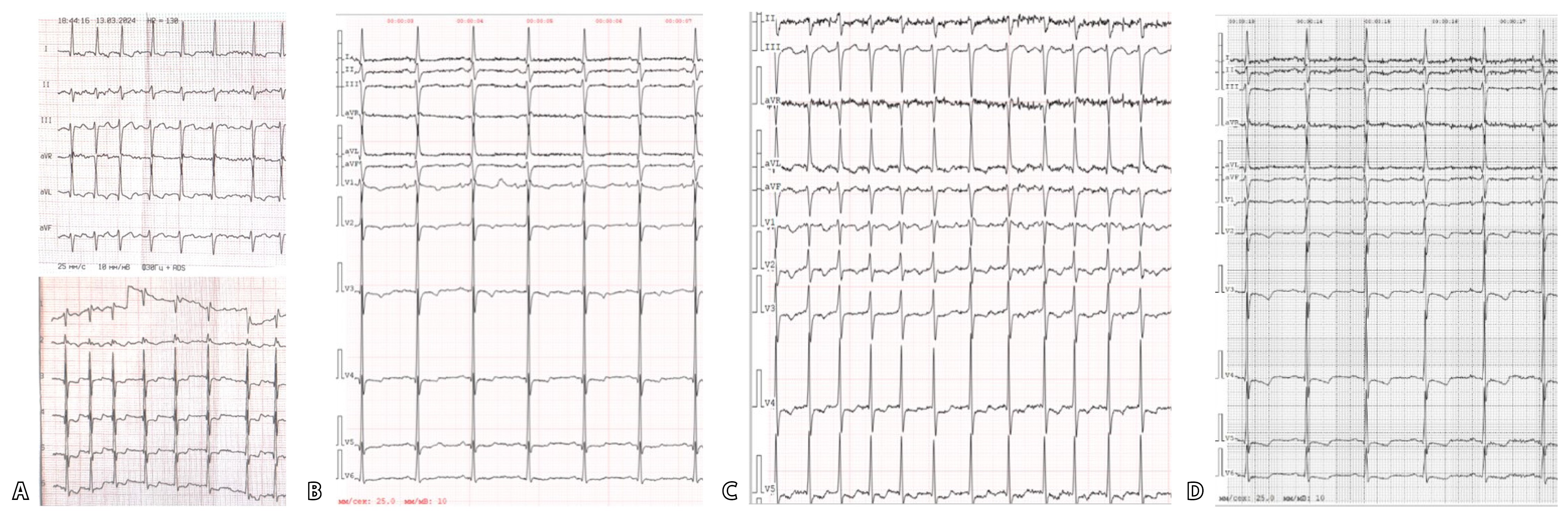Рис. 1. Серия электрокардиограмм пациента: А – 13.03.2024, фибрилляция предсердий, частота сердечных сокращений (ЧСС) – 130 в минуту; Б – 14.03.2024, синусовый ритм, ЧСС – 75 в минуту; В – 20.03.2024, фибрилляция предсердий, ЧСС – 140 в минуту; Г – 21.03.2024, синусовый ритм, ЧСС – 71 в минуту