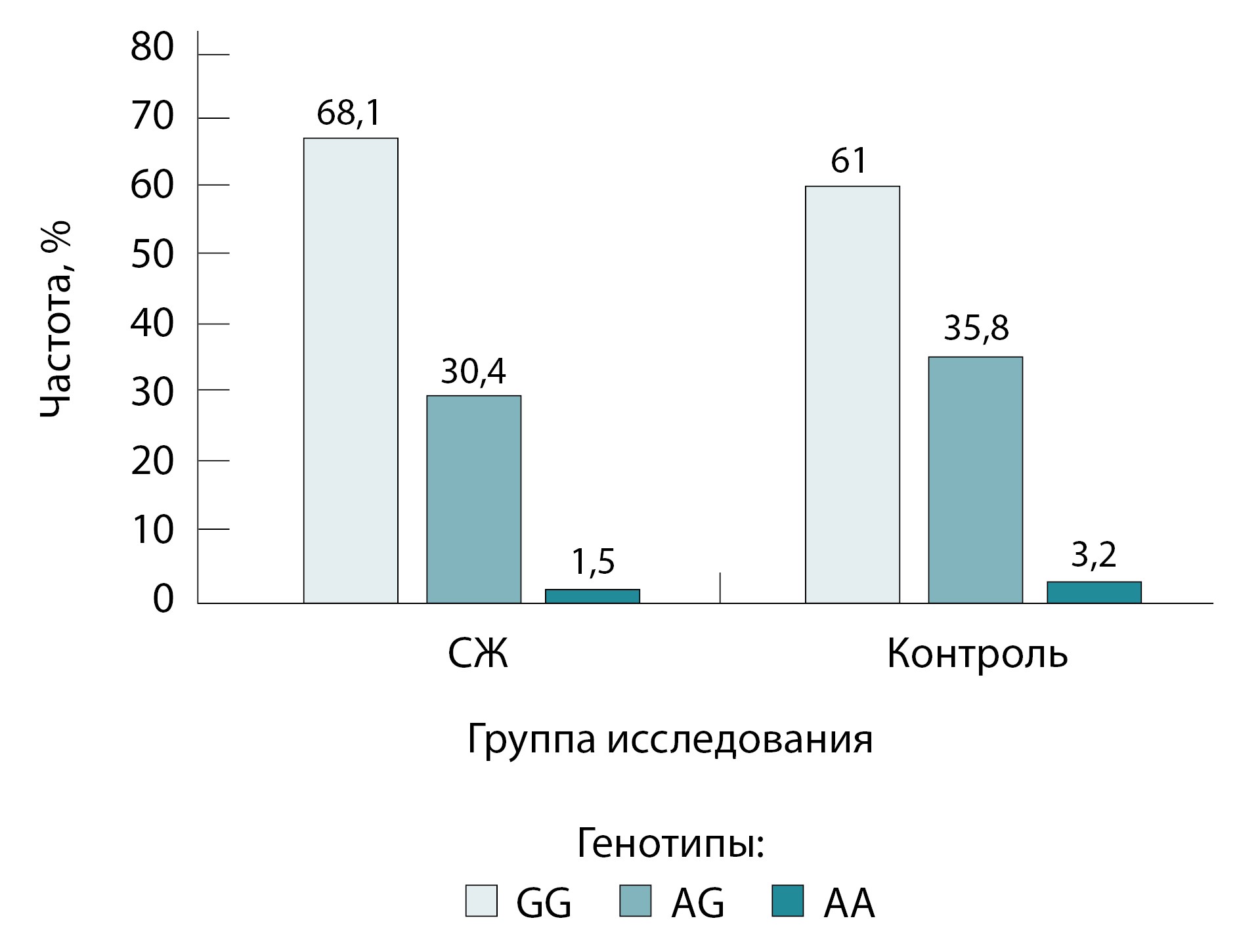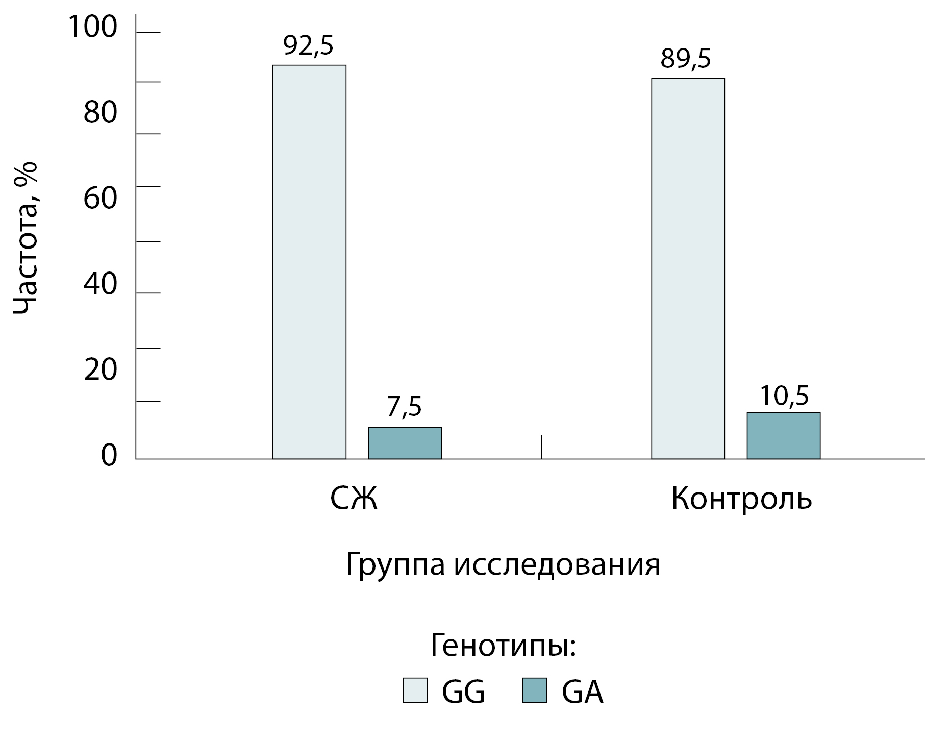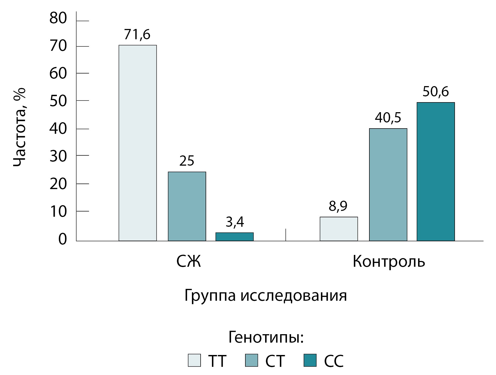 3. Рис. 2. Частоты генотипов rs4148325 гена UGT1A1 в группе синдрома Жильбера (СЖ) и контрольной группе