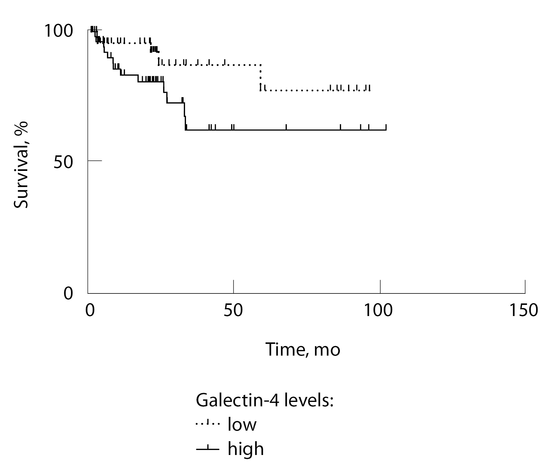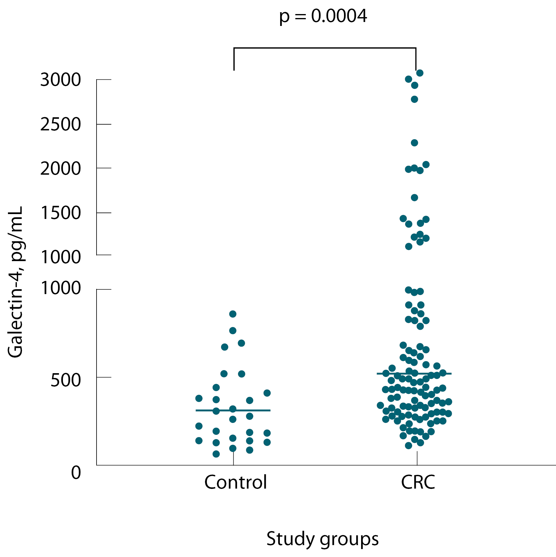 Conclusion: The amounts of the soluble galectin-4 are associated with tumor progression, indicating a possible tumor-promoting function of this protein. However, its diagnostic value remains limited, as the method of serum galectin-4 determination has shown insufficient sensitivity and specificity for its routine use for the diagnosis of CRC. According to the results of univariate and multivariate analyses, serum galectin-4 is not a significant prognostic marker of CRC.