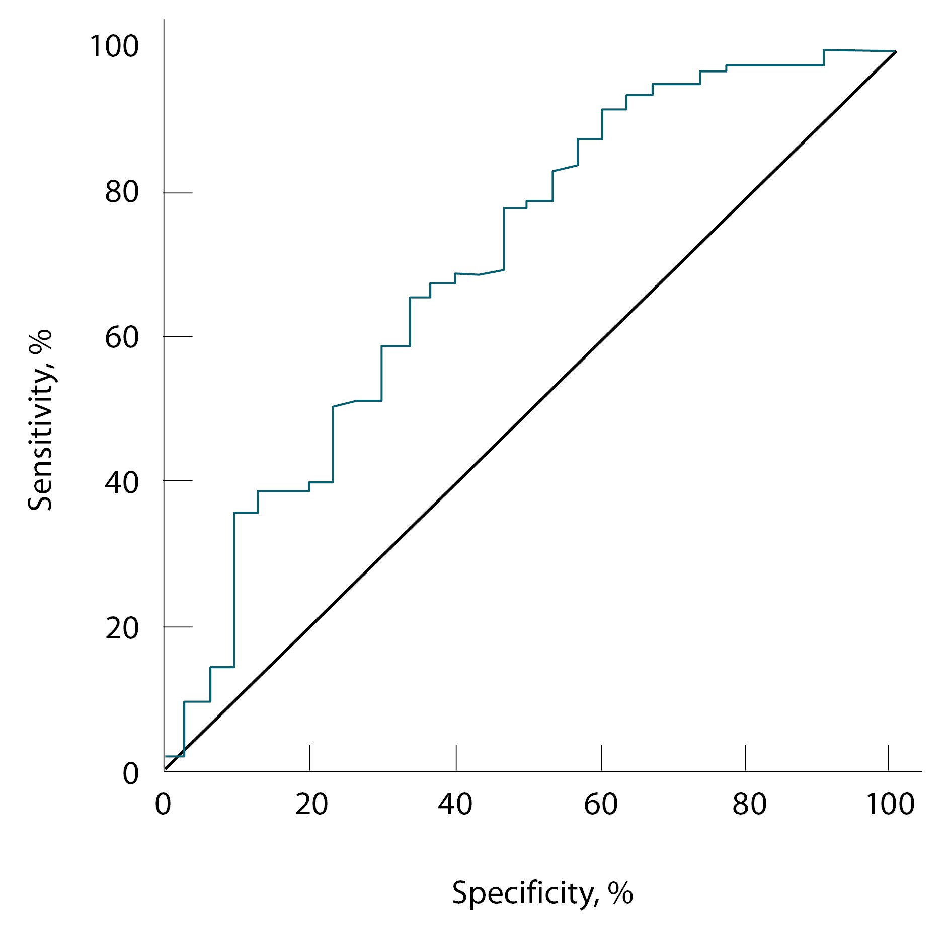 Рис. 2. Анализ ROC-кривых для галектина-4 у больных колоректальным раком; площадь под ROC-кривой составляет 0,706 (p = 0,0005)