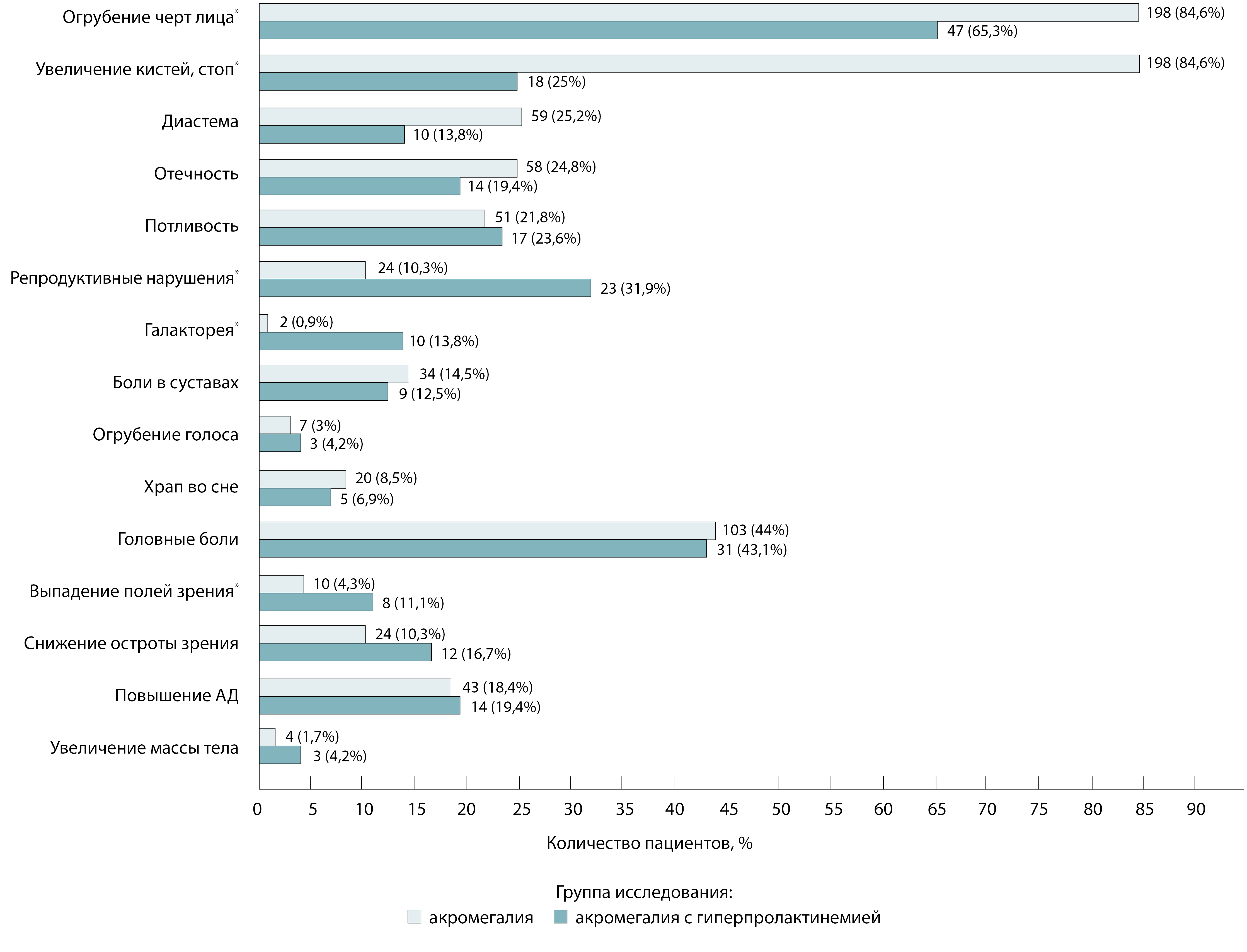 У пациентов с акромегалией и гиперпролактинемией по сравнению с пациентами без сопутствующей гиперпролактинемии реже наблюдаются характерные изменения внешности, несмотря на сходную биохимическую активность акромегалии; чаще встречаются репродуктивные нарушения у женщин, что может скрывать акромегалию под маской гиперпролактинемического гипогонадизма. Симптомы заболевания при сопутствующей гиперпролактинемии появляются в более молодом возрасте, при этом чаще отмечаются репродуктивные нарушения и выпадение полей зрения вследствие значительных размеров аденомы гипофиза. Отличительными чертами гиперпролактинемии при акромегалии могут быть несоответствие значимого размера макроаденомы гипофиза и умеренного повышения уровня пролактина, что без исследования уровня ИРФ-1 может быть интерпретировано как признаки гормонально-неактивной аденомы гипофиза со сдавлением гипофизарной воронки. Результаты нашего исследования подчеркивают важность исключения акромегалии у пациентов с пролактиномами, а также при подозрении на синдром сдавления ножки гипофиза (для которого характерна умеренная гиперпролактинемия на фоне супраселлярного роста аденомы гипофиза) даже в отсутствие патогномоничных признаков гиперсекреции ГР. Наличие гиперпролактинемии не влияет на исходы лечения акромегалии и более частое назначение АгД не приводит к увеличению доли пациентов с биохимическим контролем основного заболевания.
