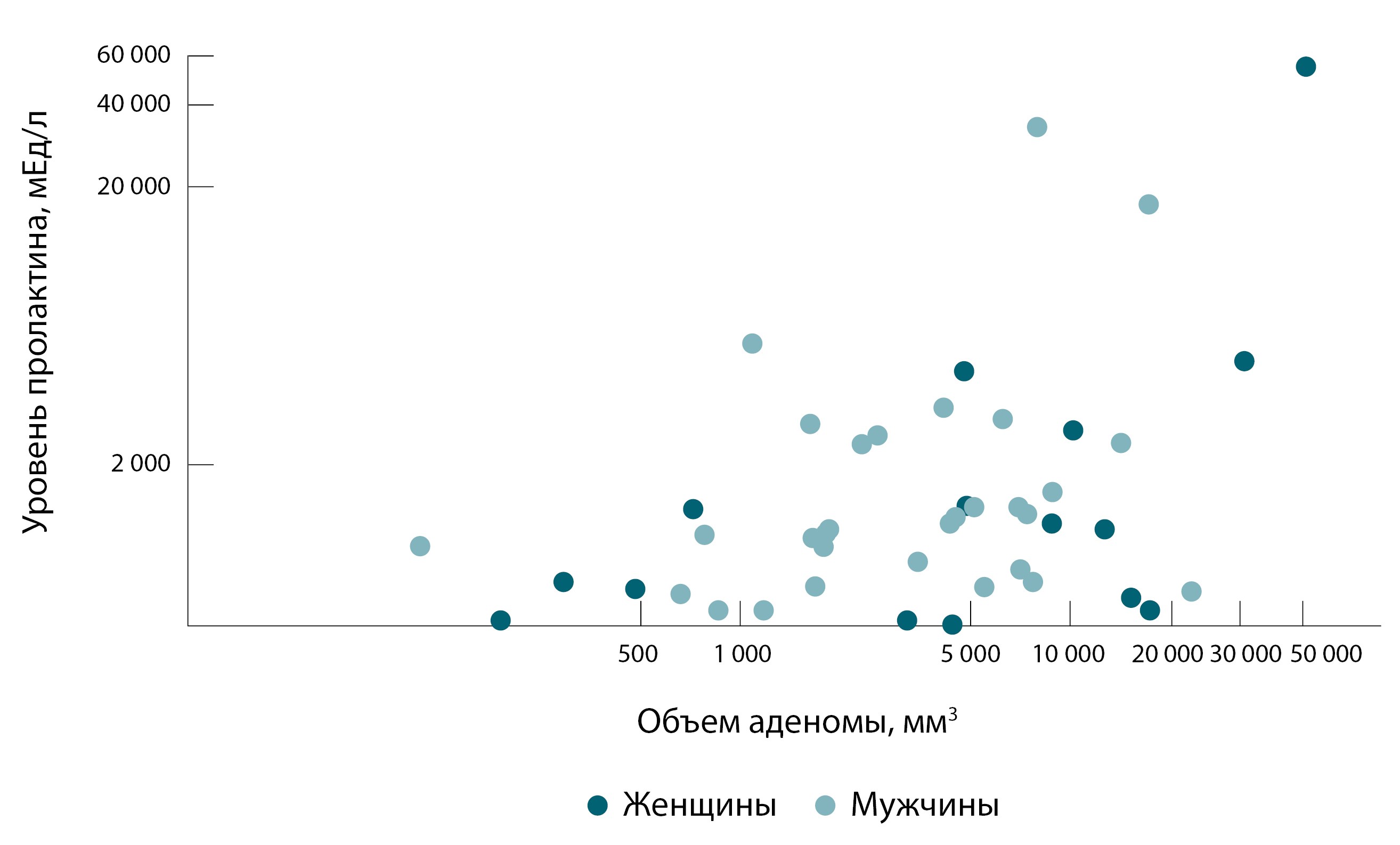 - зависимость уровня пролактина от объема аденомы в начале заболевания до лечения.