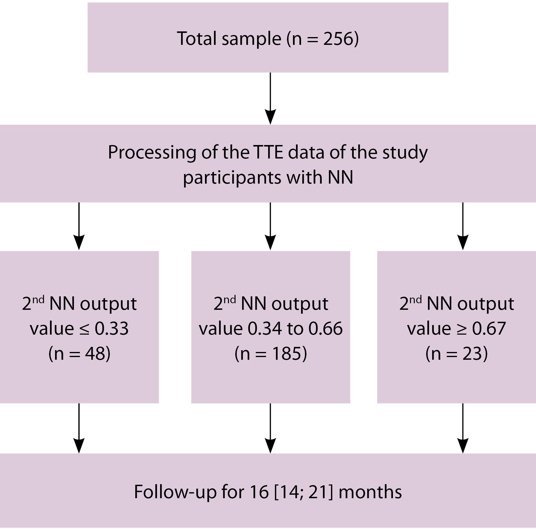 В ранее проведенном исследовании мы разработали нейросеть (НС), способную определять вероятность наличия у пациентов ФП по данным ТТЭ [6]. В текущем исследовании эту НС использовали для идентификации пациентов, подверженных высокому риску развития ФП, что подтверждалось путем мониторинга данных в течение 16 [14; 21] месяцев.