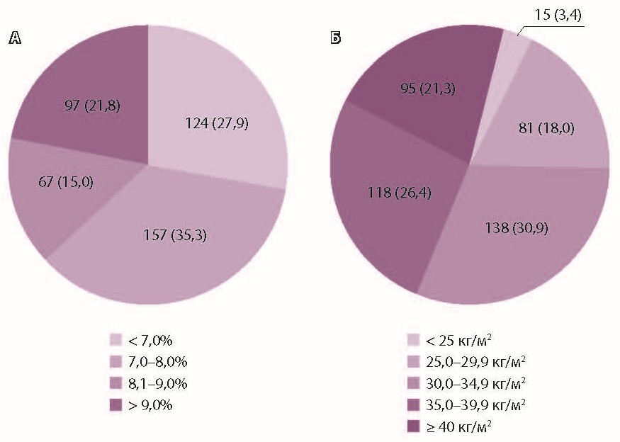 Рис. 1. Распределение пациентов в зависимости от уровня гликированного гемоглобина (А) и индекса массы тела (Б) до назначения препарата иГларЛикси. Данные представлены как абсолютное число пациентов и их доля (%) в группе
