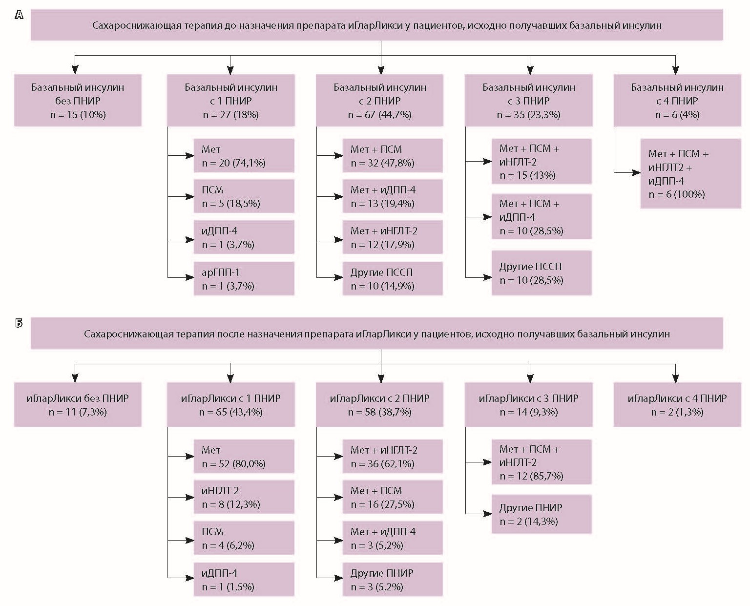 Рис. 2. Структура сахароснижающей терапии в группе больных, исходно получавших базальный инсулин, до (А) и после (Б) назначения иГларЛикси. арГПП-1 – агонист рецепторов глюкагоноподобного пептида 1, иГларЛикси – фиксированная комбинация инсулина гларгин 100 Ед/мл и ликсисенатида, иДПП-4 – ингибиторы дипептидилпептидазы 4-го типа, иНГЛТ-2 – ингибиторы натрий-глюкозного котранспортера 2-го типа, Мет – метформин, ПНИР – препараты неинсулинового ряда, ПСМ – препараты сульфонилмочевины, ПССП – пероральные сахароснижающие препараты. Данные представлены как абсолютное число пациентов и их доля (%) в группе. По горизонтали за 100% принято общее число пациентов, исходно получавших базальный инсулин. По вертикали за 100% принято общее число пациентов, получавших определенное количество ПНИР в сочетании с базальным инсулином (А) или с инсулином гларгин (Б)