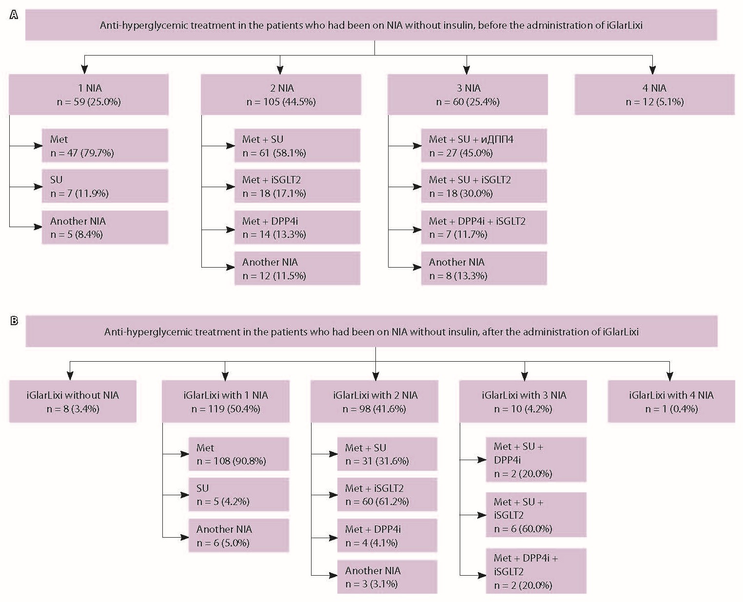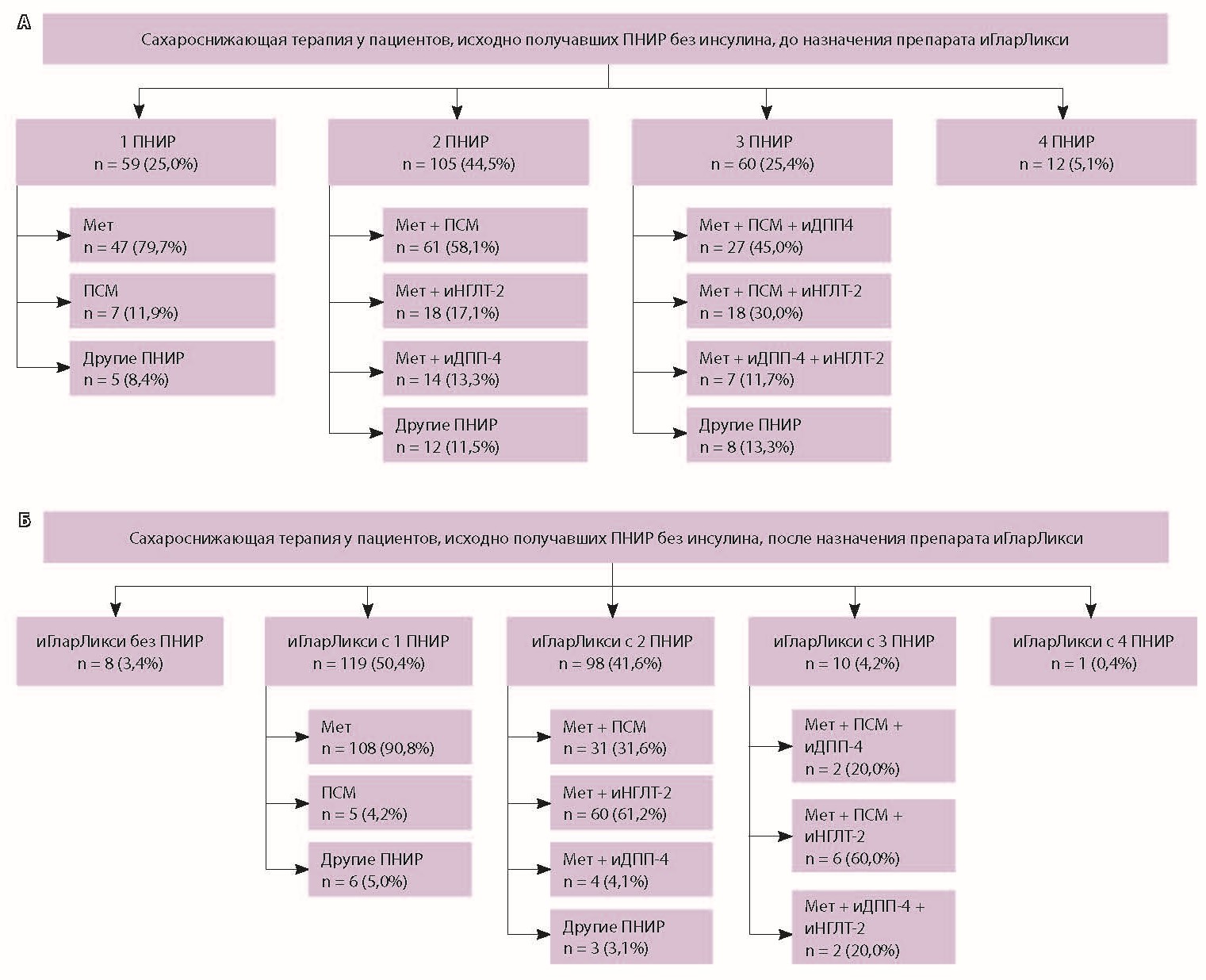 Рис. 3. Структура сахароснижающей терапии в группе больных, получавших ПНИР без инсулина, до (А) и после (Б) назначения иГларЛикси. иГларЛикси – фиксированная комбинация инсулина гларгин 100 Ед/мл и ликсисенатида, иДПП-4 – ингибиторы дипептидилпептидазы 4-го типа, иНГЛТ-2 – ингибиторы натрий-глюкозного котранспортера 2-го типа, Мет – метформин, ПНИР – препараты неинсулинового ряда, ПСМ – препараты сульфонилмочевины. Данные представлены как абсолютное число пациентов и их доля (%) в группе. По горизонтали за 100% принято общее число пациентов, исходно получавших ПНИР. По вертикали за 100% принято общее число пациентов, получавших определенное количество ПНИР до назначения препарата иГларЛикси (А) и после назначения иГларЛикси (Б)